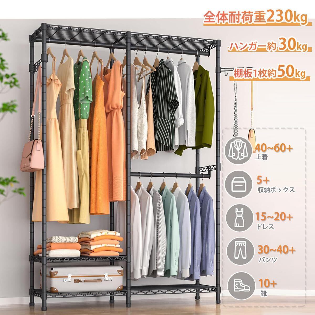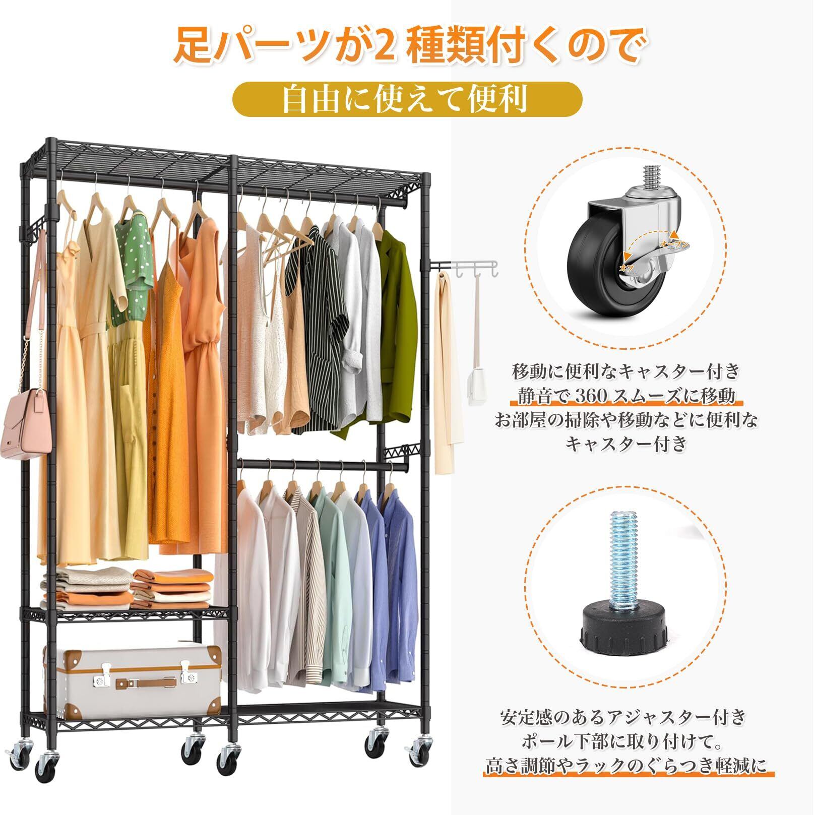 【ハンガーラック 商品サイズ】商品仕様:幅約97×奥行40×高さ190cm(アジャスター含む) ;洋服ラック本体重量(約):11.9kg;全体耐荷重(約):230kg;お客様組み立てが必要な商品です。ワードローブ豊富な収納スペースを備え、あらゆる種類の服を掛け、布団を収納可能。シンプル収納棚には下着、パンツ、日常の小物などを簡単に収納可能。下に靴下やポクッスなども収納可能。