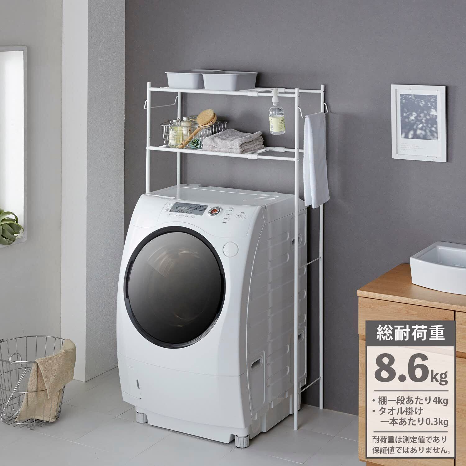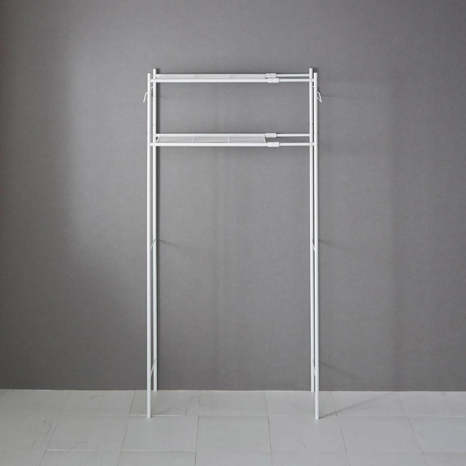 インテリアに馴染むマットな質感。細めのパイプを使用したスリムな洗濯機ラック。シンプルな2段の棚で空間を有効活用できます。