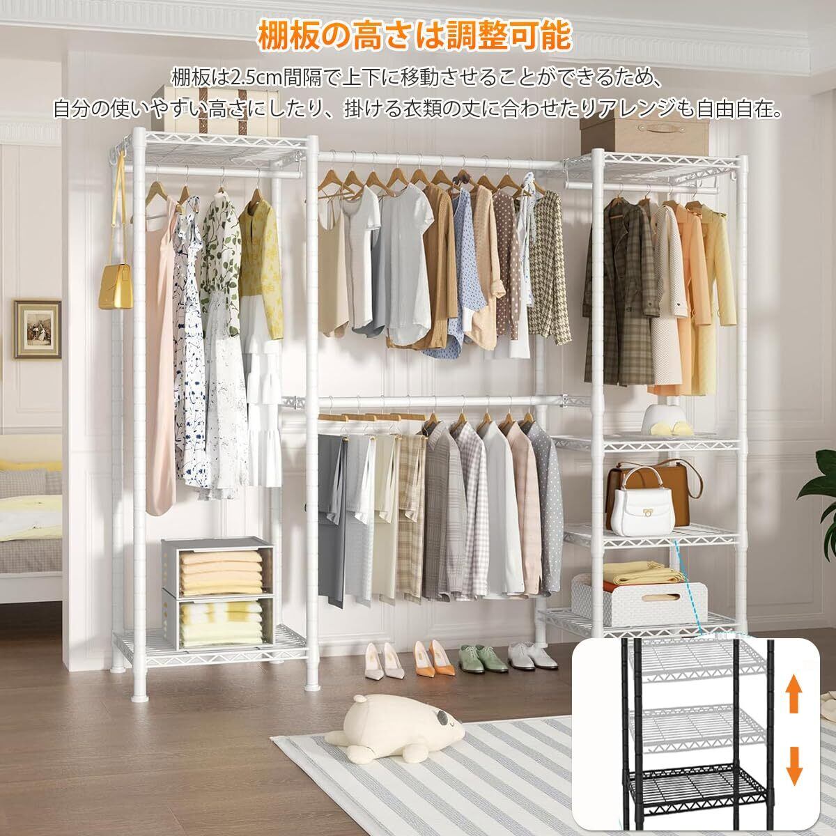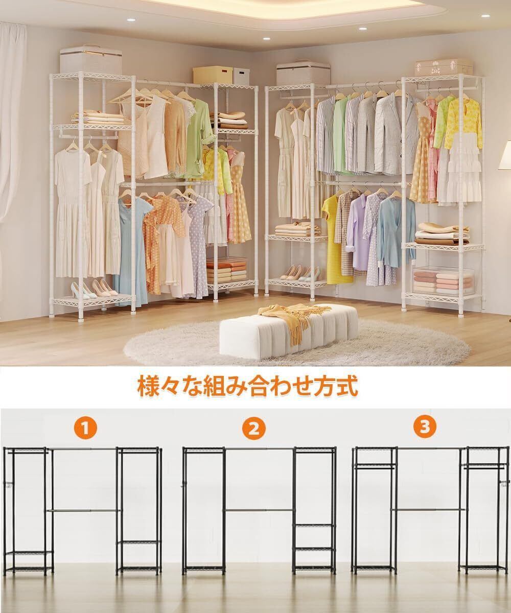 【様々な組み合わせタイプ】ポールに入った溝で棚板の高さが変えられるので、収納する物に合わせて、ムダなく最適なスペースで収納できます。伸縮ポール2本使わない時は、洋服かけラックは単独の2つの収納ラックに変身します!シンプル収納棚には衣類、日常の小物などを簡単に収納できるし、下に靴やポクッスなども便利収納できます。