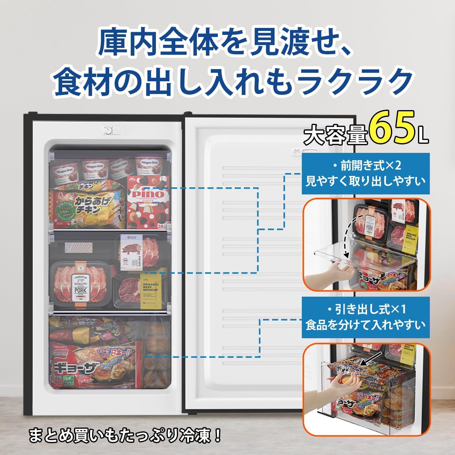 【取り出しやすい&スッキリを実現】 ●庫内全体を見渡せる3段の冷凍ケース:透明なので中身が一目でわかります。整理整頓もしやすい。 ●前開き式ケース*2:奥にある食材もスムーズに取り出せます。蓋で雑菌やホコリの侵入を防ぎ、扉の開閉により庫内の温度も保ちます。 ●引き出し式ケース*1:見やすく取り出しやすい。外気の侵入を防ぎ、冷気も外に漏れにくい。