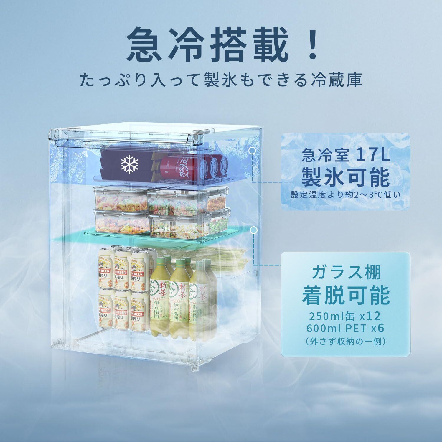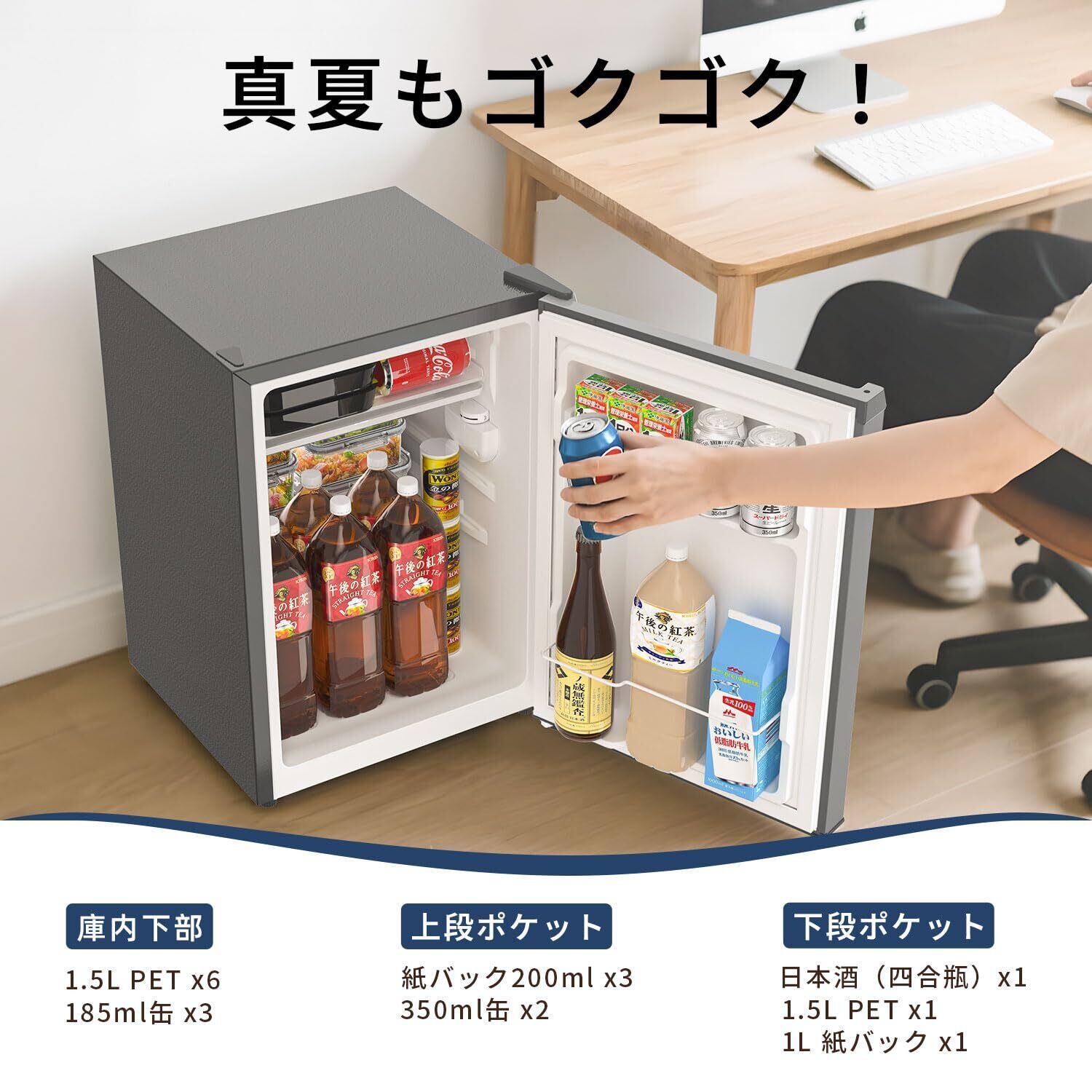 【2段収納+製氷スペース & 小さくても使いやすい】 庫内は実用的な2段構造で、飲料、野菜、デザートなどをスッキリ整理整頓。扉ポケットにはペットボトルや調味料の収納が可能です。さらに上部には製氷スペースを備え、氷や冷凍食品の保存にも対応。庫内は見やすく取り出しやすいため、日常使いがとても快適です。