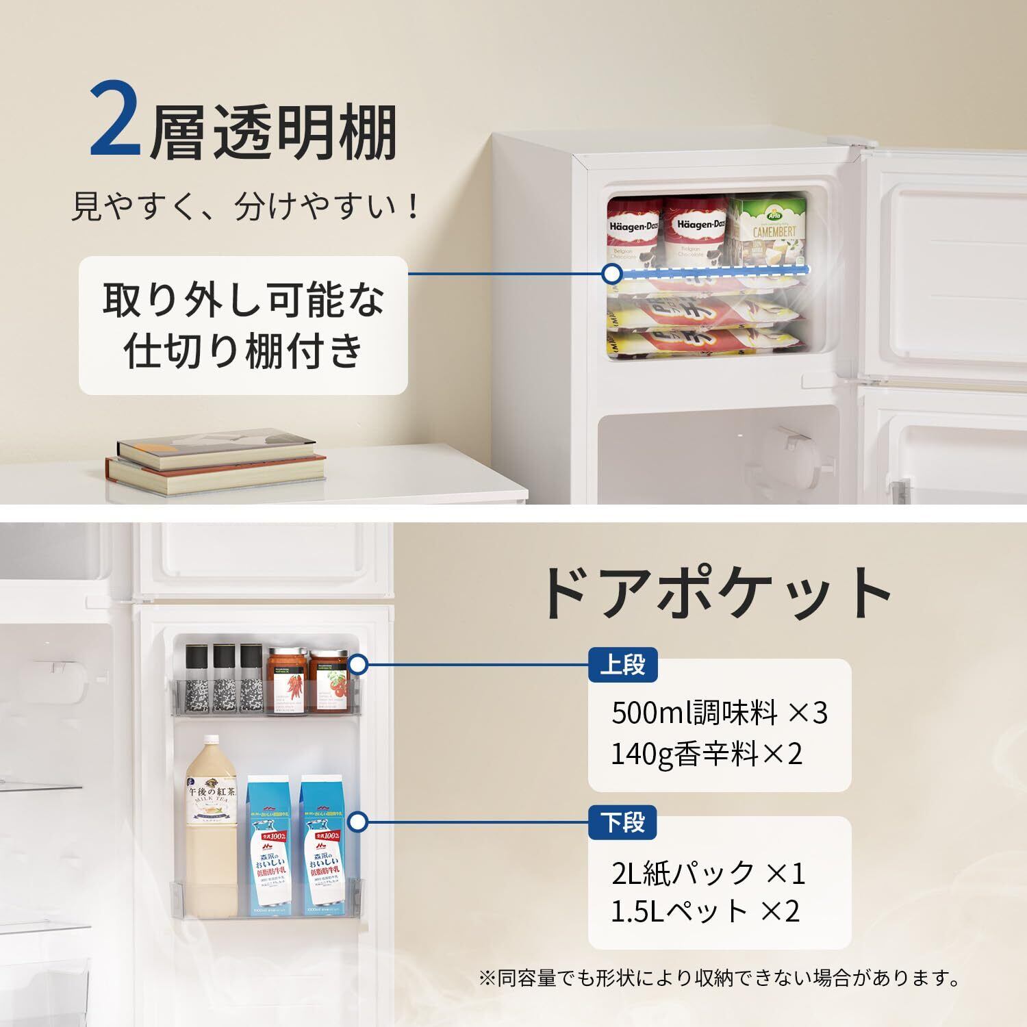 【便利な右開きダブルドアで省エネ強化!】右開きダブルドア設計により、頻繁に使用する冷蔵室だけをサッと開閉可能。冷蔵室だけを開閉して冷気流出を約50%低減。高効率冷却と連動することで、年間消費電力量218kwhの省エネ性能を実現。狭いキッチンでもストレスフリーな使い勝手で、一人暮らしの節約生活をサポートします。