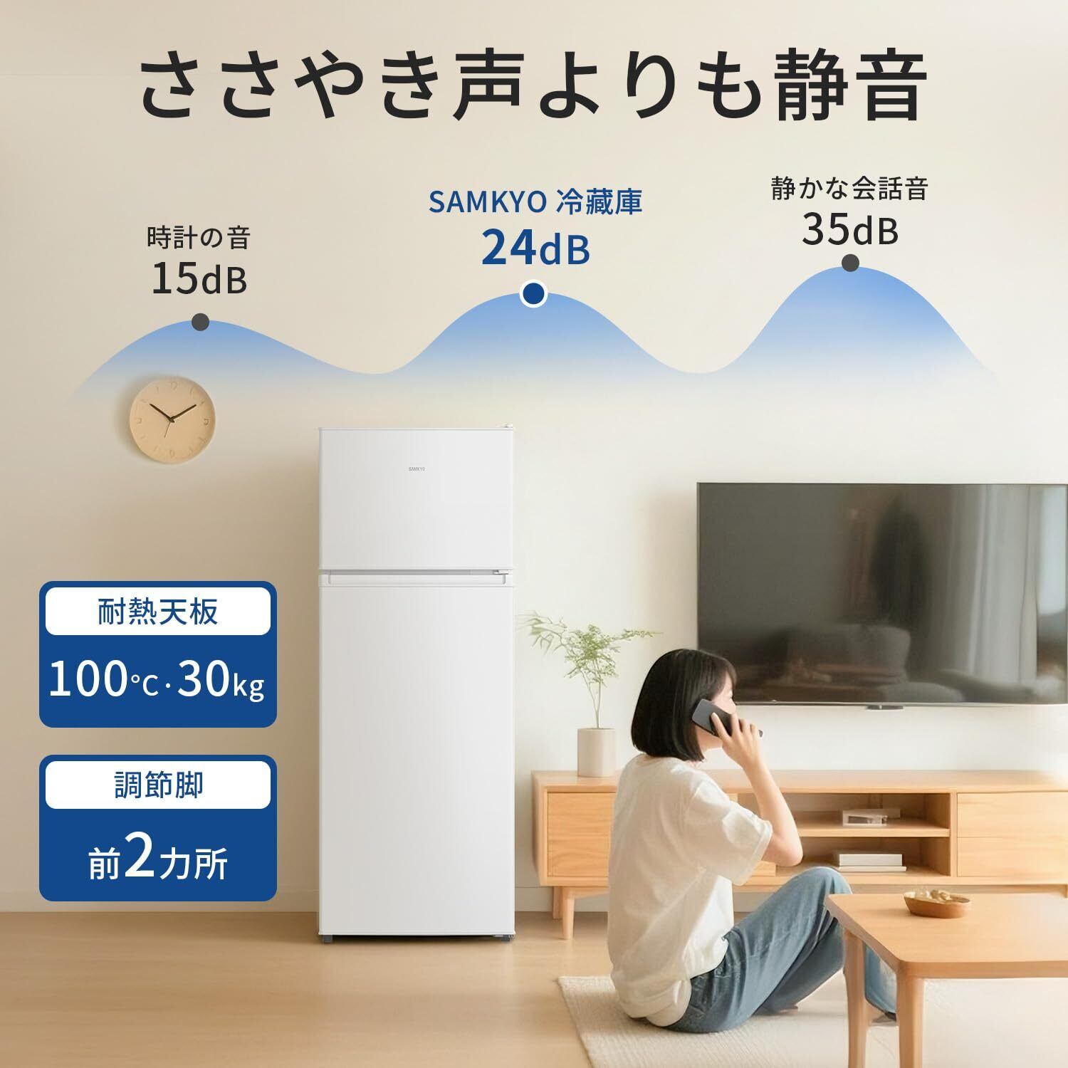 【超静音24dB&高耐久!】優れた静音技術により、運転音は約24dB(図書館並みの静けさ)を実現。夜間や寝室の近くでも気にならず、安眠とリラックスを妨げません。さらに、耐熱100℃の棚板と棚板耐荷重30kgの頑丈設計で、調理器具の一時置き場や重い保存容器も安心です。長く快適な一人暮らしを支えます。