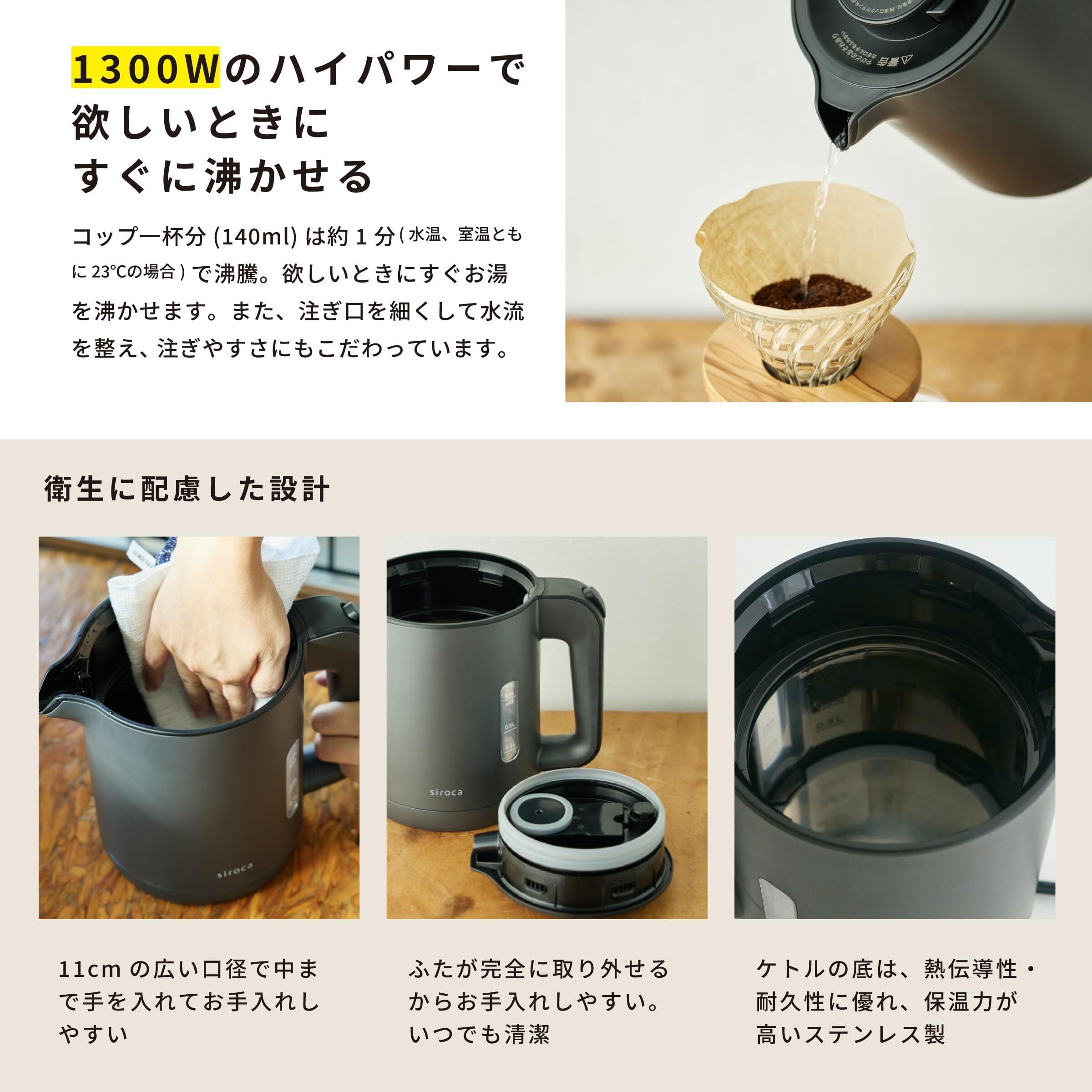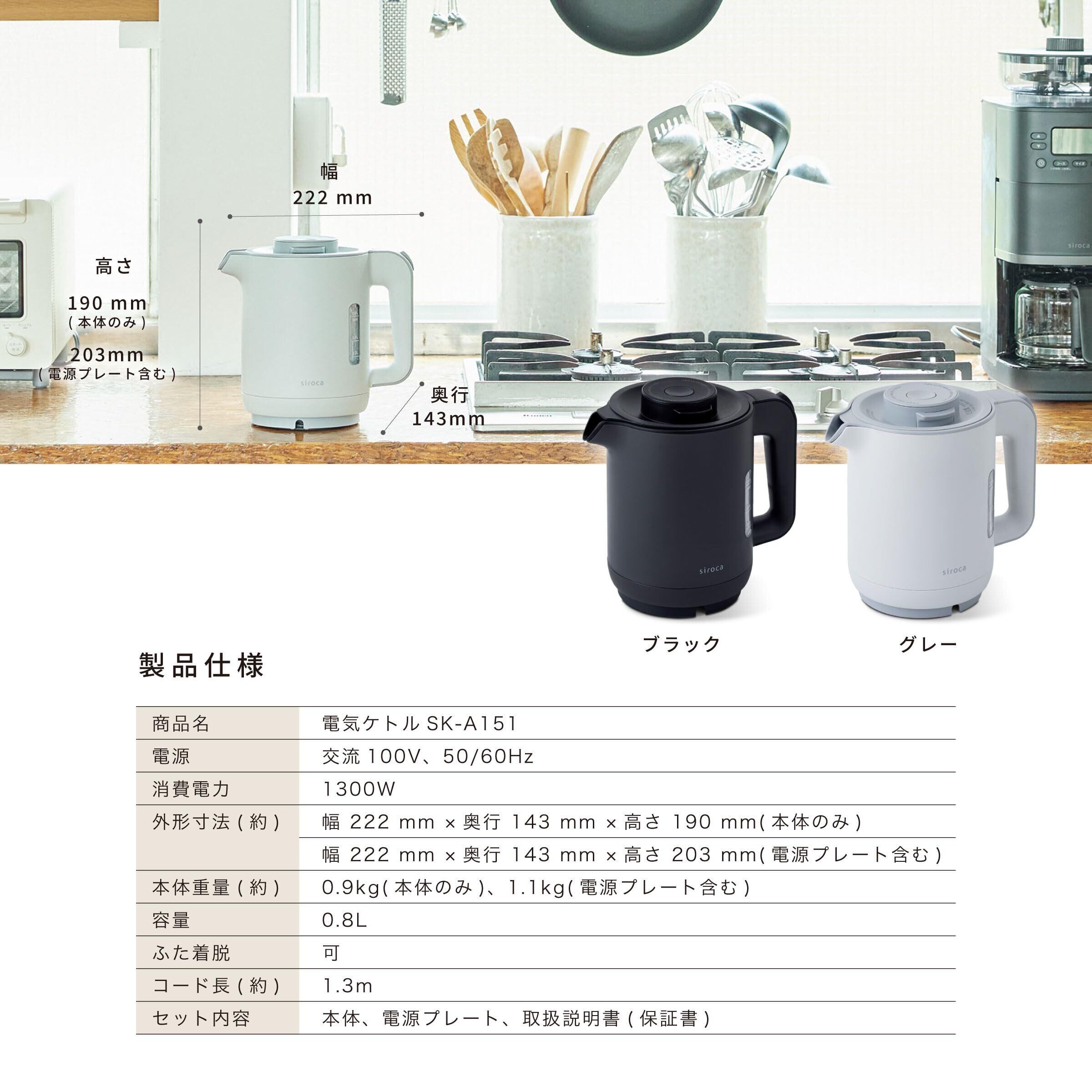 シロカ 電気ケトル [ミニポット/電気ポット/0.8L/1300W/ハイパワー/蒸気セーブ機能/安心設計/ふた着脱可/おしゃれ/ギフト/プレゼント] SK-A151(H) グレー