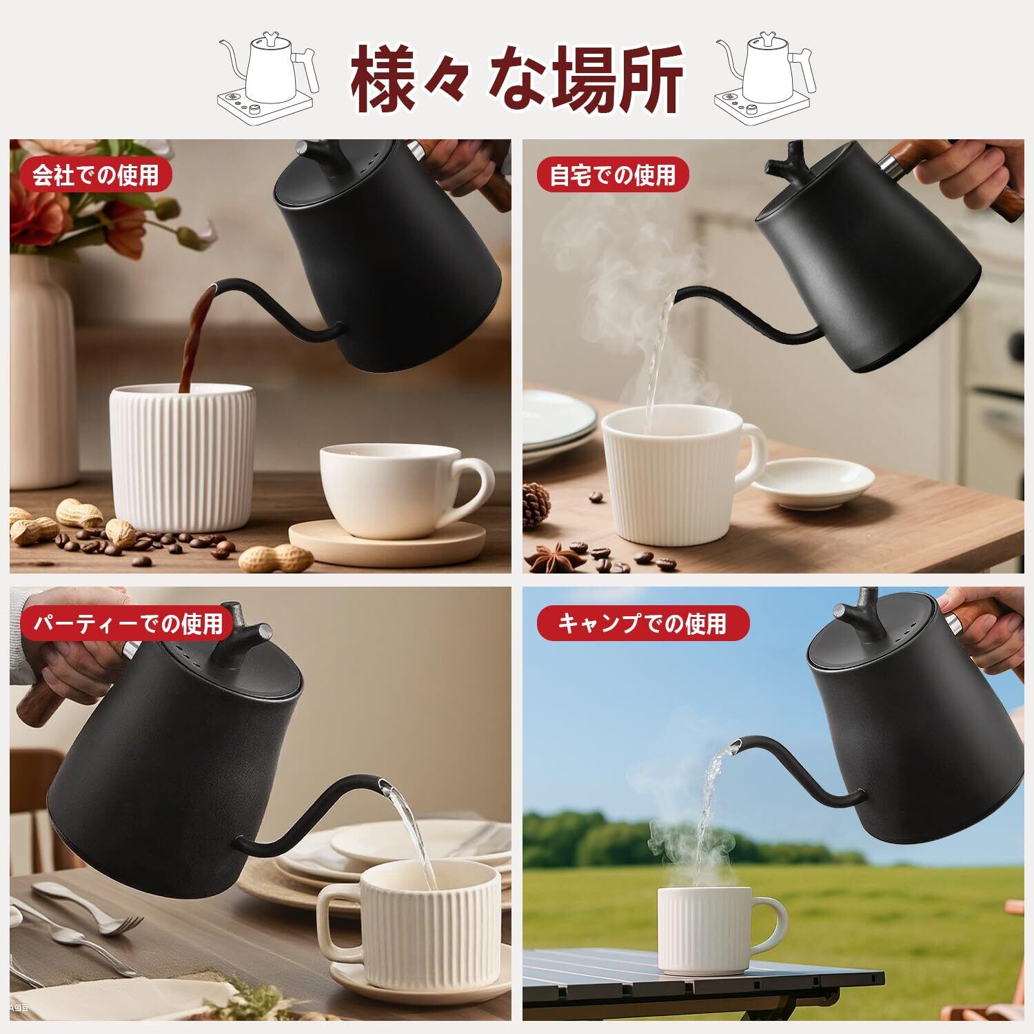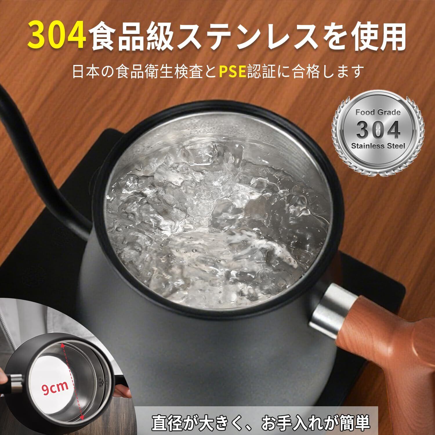【安定感のあるハンドル・やけどを防止】洗練された角度のハンドルは、お湯の量を簡単に調節でき、一滴ずつ注ぐことができます。厚みのある丸みを帯びたハンドルは、長時間使用しても快適に握ることができます。ハンドルと本体の間隔は4.5cmで、親指でしっかりと握ることができます。体を少し傾けるだけで、お湯を注ぎたい場所に正確に注ぐことができます。ケトルの外側には、取り扱い中のやけどを防ぐため、厚みのあるやけど防止ストリップが付いています。