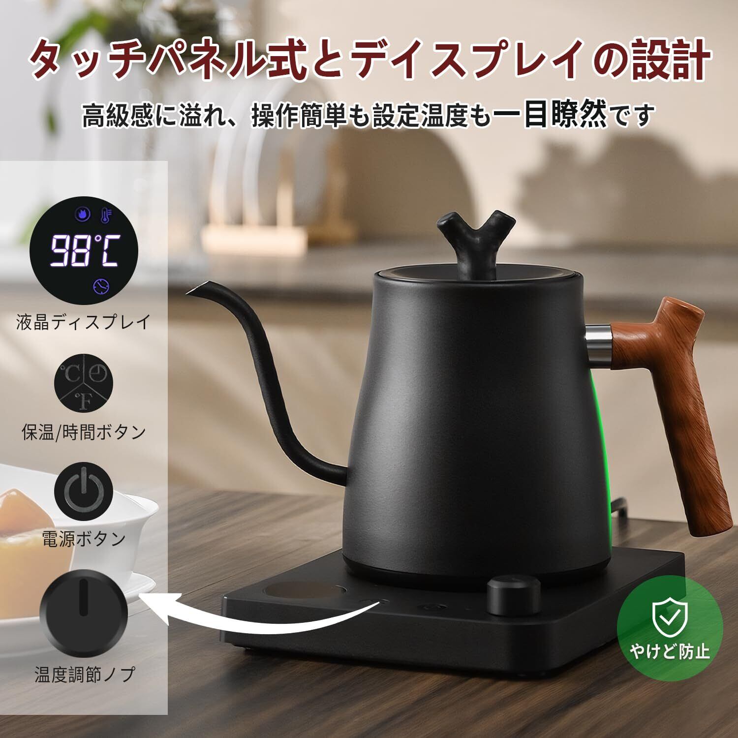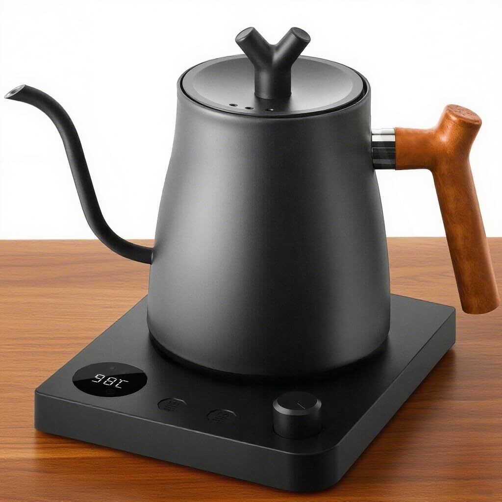 電気ケトル コーヒー ドリップケトル 1.0L 約36分保温 800W コーヒーポット 火傷防止ハンドル 温度調節 (1℃単位)/空焚き防止/通知音オン・オフ/PSE認証済み 細口 紅茶 お茶 クリスマス 新年 プレゼント用 ドリップ ポット 木目調 キッチン用品 ブラック