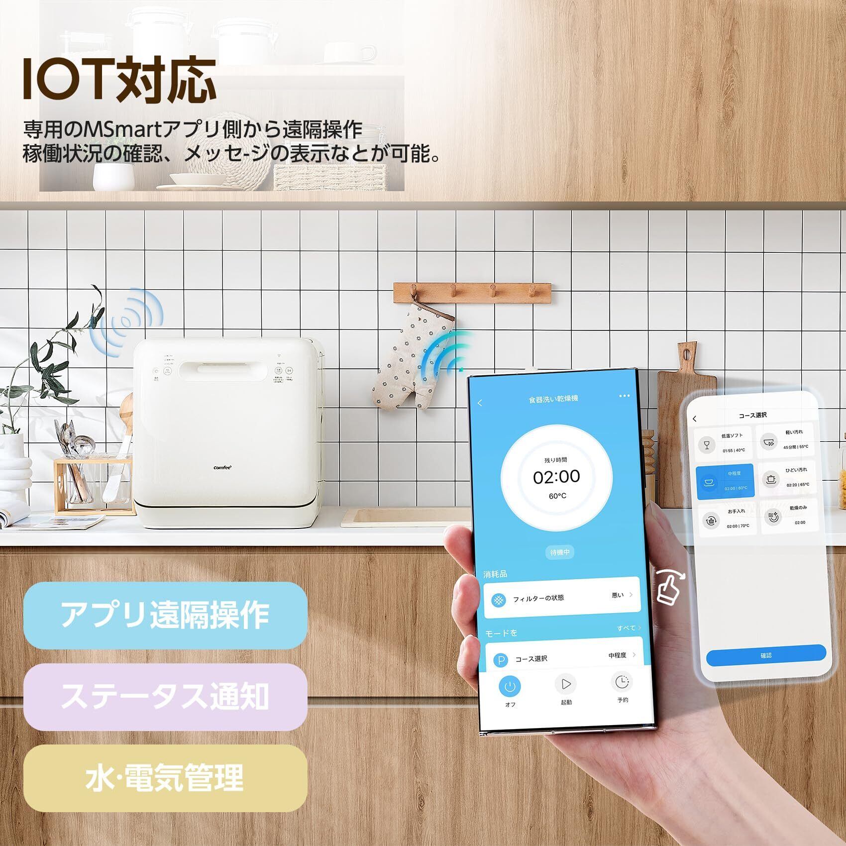 COMFEE' 食洗機 1-3人用 IOT遠隔操作 食器洗い乾燥機 工事不要 大容量 360°洗浄 熱風乾燥 節水 コンパクト 75℃高温洗浄 状態通知 CDWMT0202C(A)-JP ホワイト