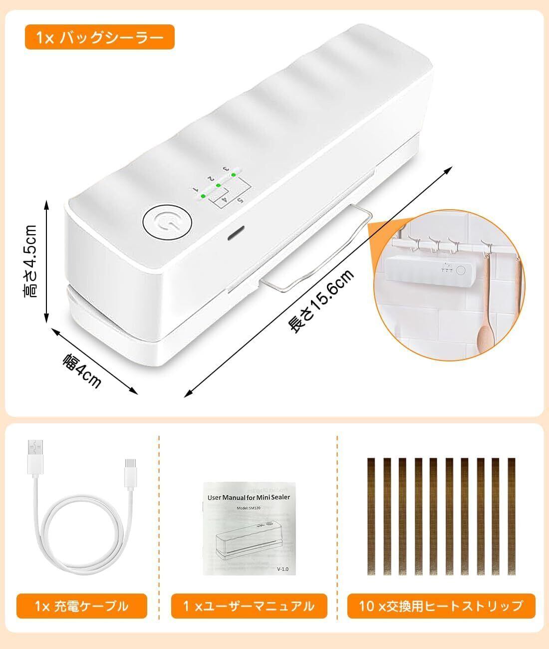 YIK TUNG ミニ シーラー バッグシーラー ミニUSB充電式フードシーラーマシン 家庭用 ヒートシーラー 5段階の加熱レベル付き 3000mAhバッテリーと4.7インチの加熱ストリップシール フードシーラー クリップ シーラー 食品スナックバッグ収納用 ハンドシーラー ハンディシーラー 密封機 小型 予熱不要 断熱ストリップ10枚 日本語取扱説明書付き (白い)