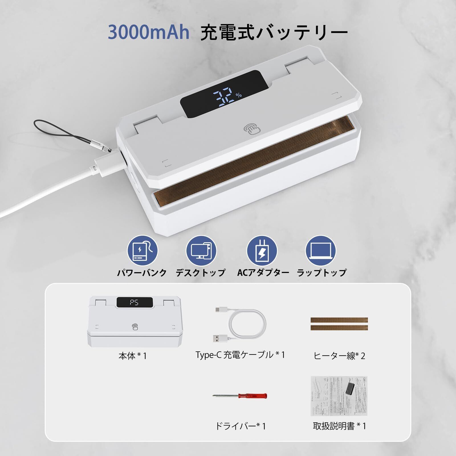 【3000mAh&Type-C充電】このハンディシーラーには3000mAhのバッテリーが内蔵されており、頻繁な電池交換の必要がなく、長期間使用できます。また、ユニバーサルType-C充電ポートを搭載しており、パワーバンク、電源タップ、ノートパソコンなど様々な方法で充電できます。いつでもどこでも簡単にシールできます。