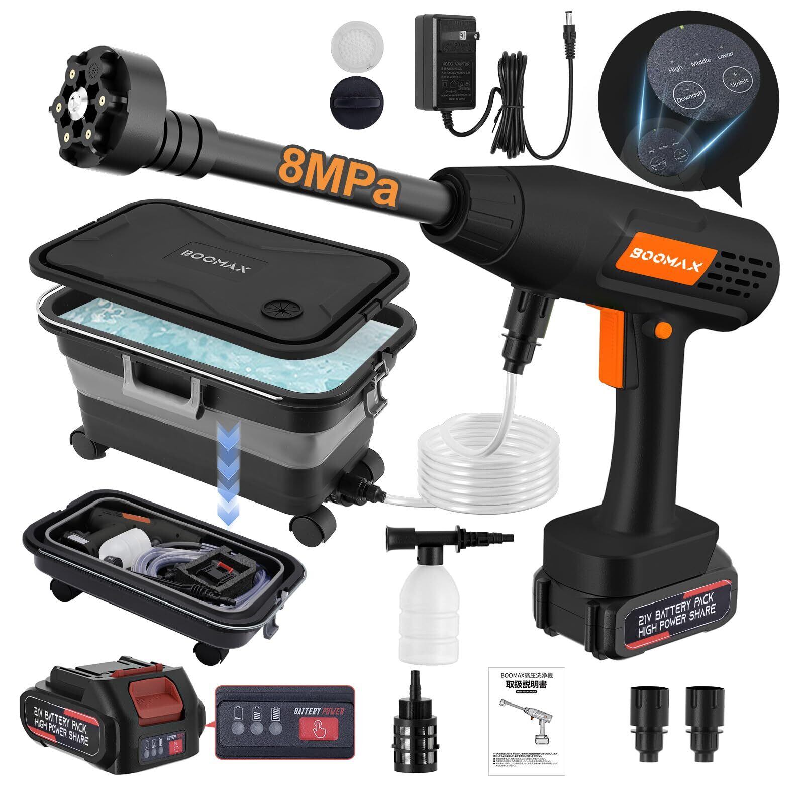 2025初登場·技術更新 Boomax高圧洗浄機 22L折り畳みバケツ付き コードレス高圧洗浄機 USB充電式 水道接続不要 3段階水压モード 約18モード調節可能 安全ロック機能搭載 ボタン長押し不要 6in1多機能ノズル フォームノズル 丈夫なホース 8MPa 噴射距離10M 洗車店監修 洗車/庭/屋外/階段/ベランダ/年末大掃除 日本語取扱説明書付き ブラック
