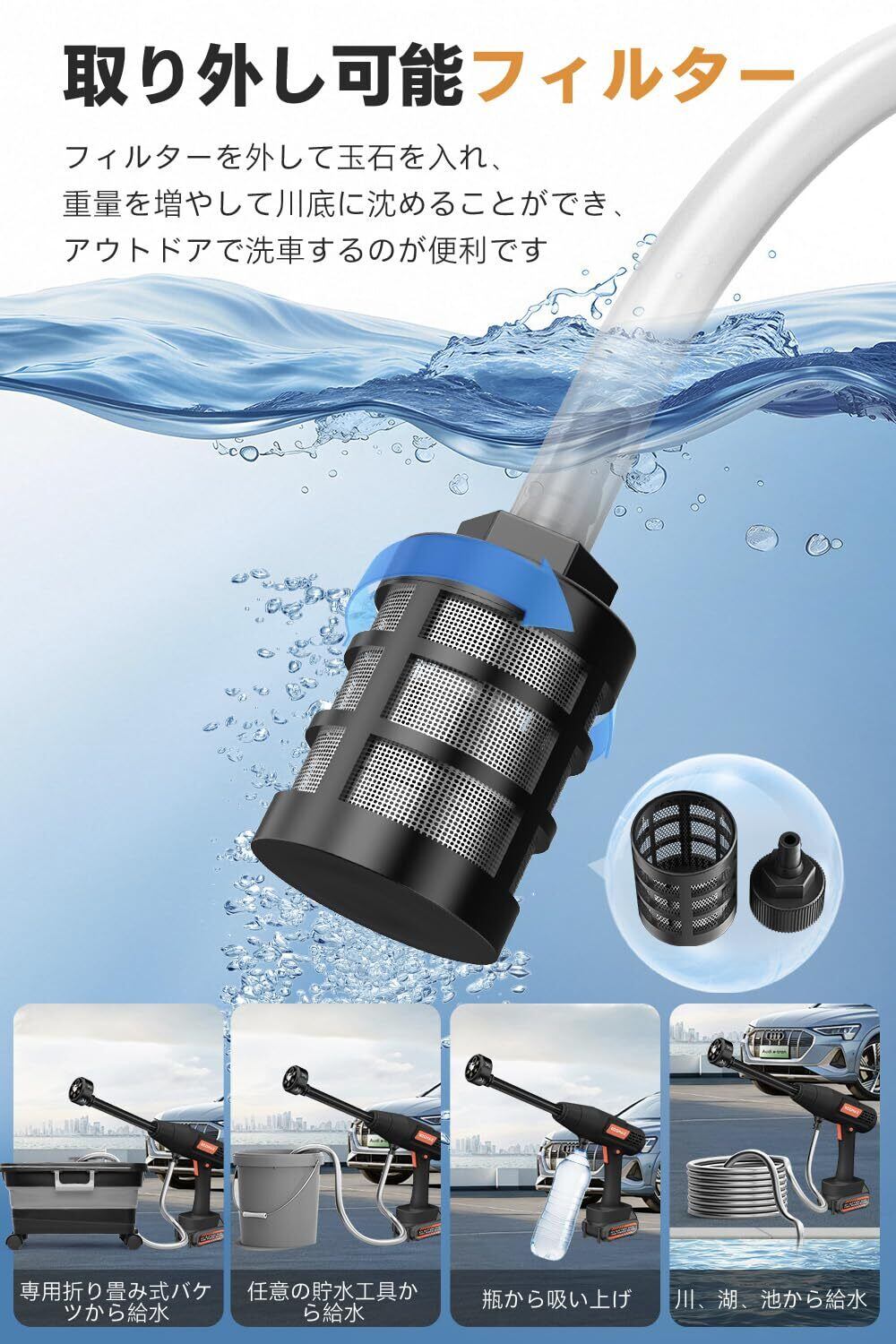 【互換と!24時間無休心強いサポート】本高圧洗浄機の日本語取扱説明書には商品の組み立てる動画も付いております。組み立ての心配はありません。ご購入の日から30日間無料交換・1年間の商品があり、万が一商品は初期不良や故障などがありましたら、また使用中に質問がある場合は、いつでもお気軽にお問い合わせください。ご満足できるまで力を尽くしています。平日には24時間以内に対応できますので、ご安心ください。「ご注文:この製品はテスト後に出荷しているので水分が多少残っている場合はありますが製品の性能に問題はありません。部品の不足や使用に関する質問がある場合は、24時間以内に当社のカスタマーサービスチームにお問い合わせください。」パッケージには、日本語取扱説明書*1、コードレス高圧洗浄機本体*1、互換可能な15000mAhバッテリー*1、電源アダプタ*1、給水ホース(5m)*1、6in1多機能ノズル*1、フォームノズル*1、給水フィルタ*1、充電アダプター*1、折り畳み式バケツ*1、ホースカップリング*2が含まれています。