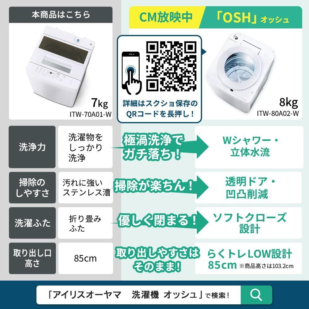 アイリスオーヤマ 洗濯機 7.0kg ホワイト ITW-70A01-W ガチ落ち大水流洗浄 部屋干しモード 新生活 一人暮らし