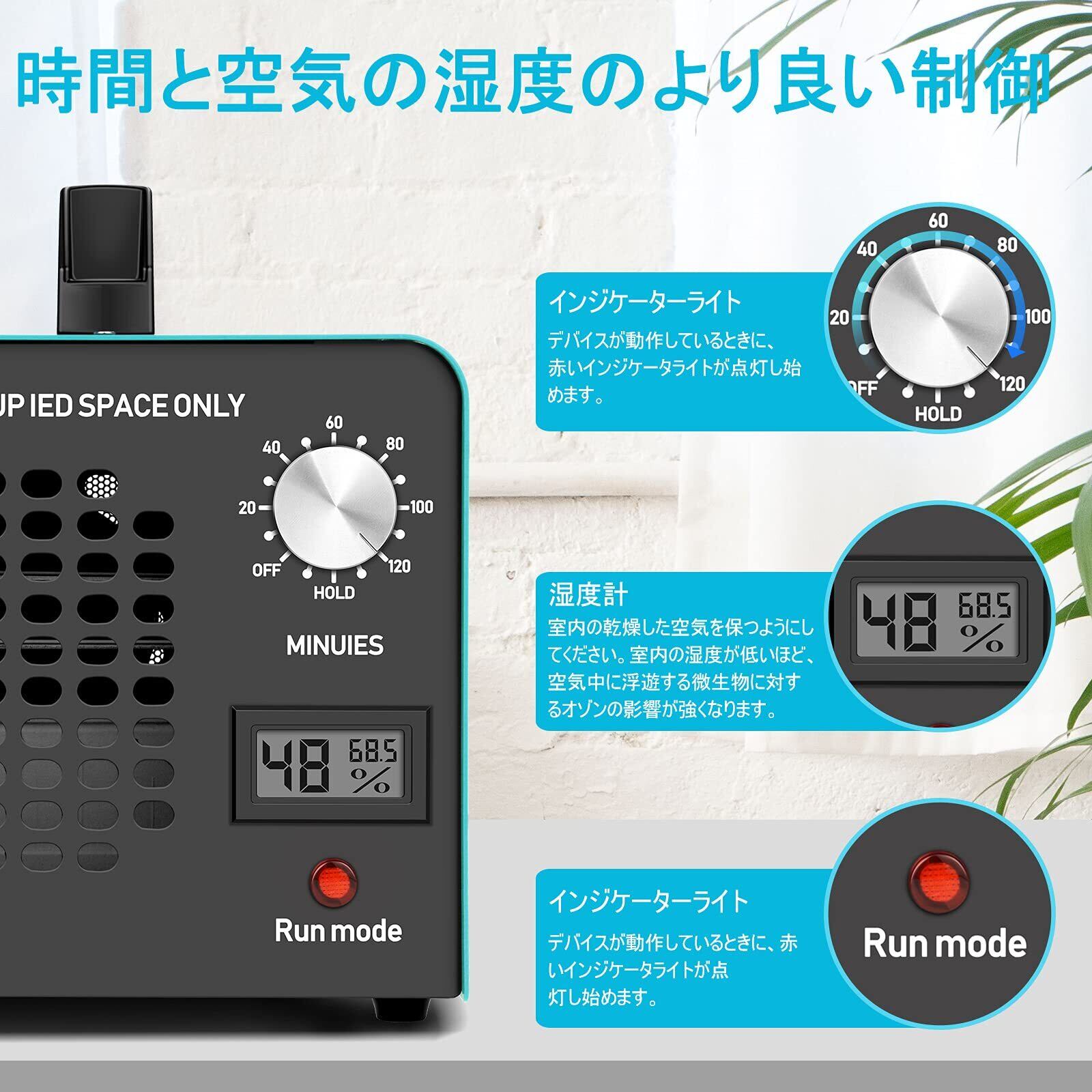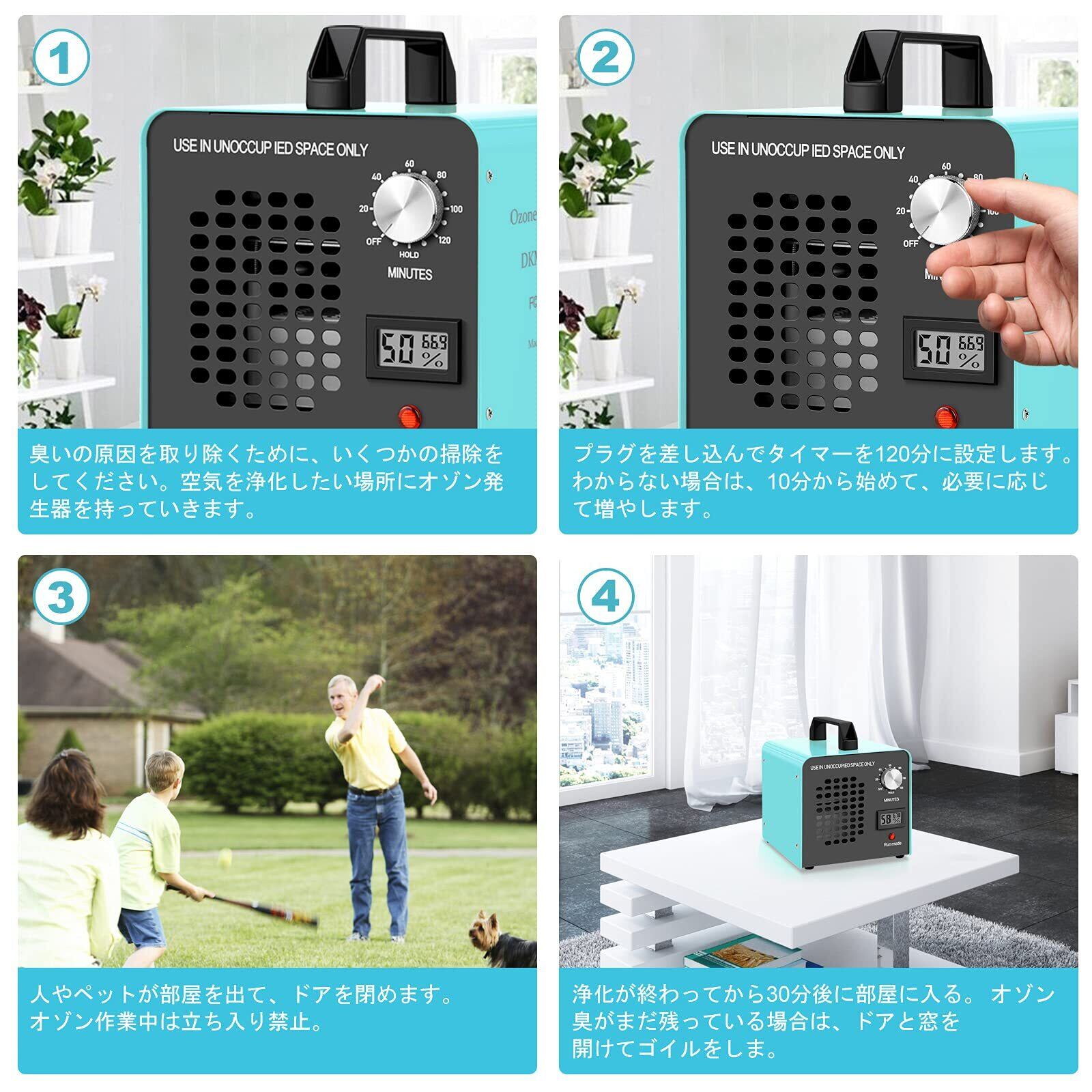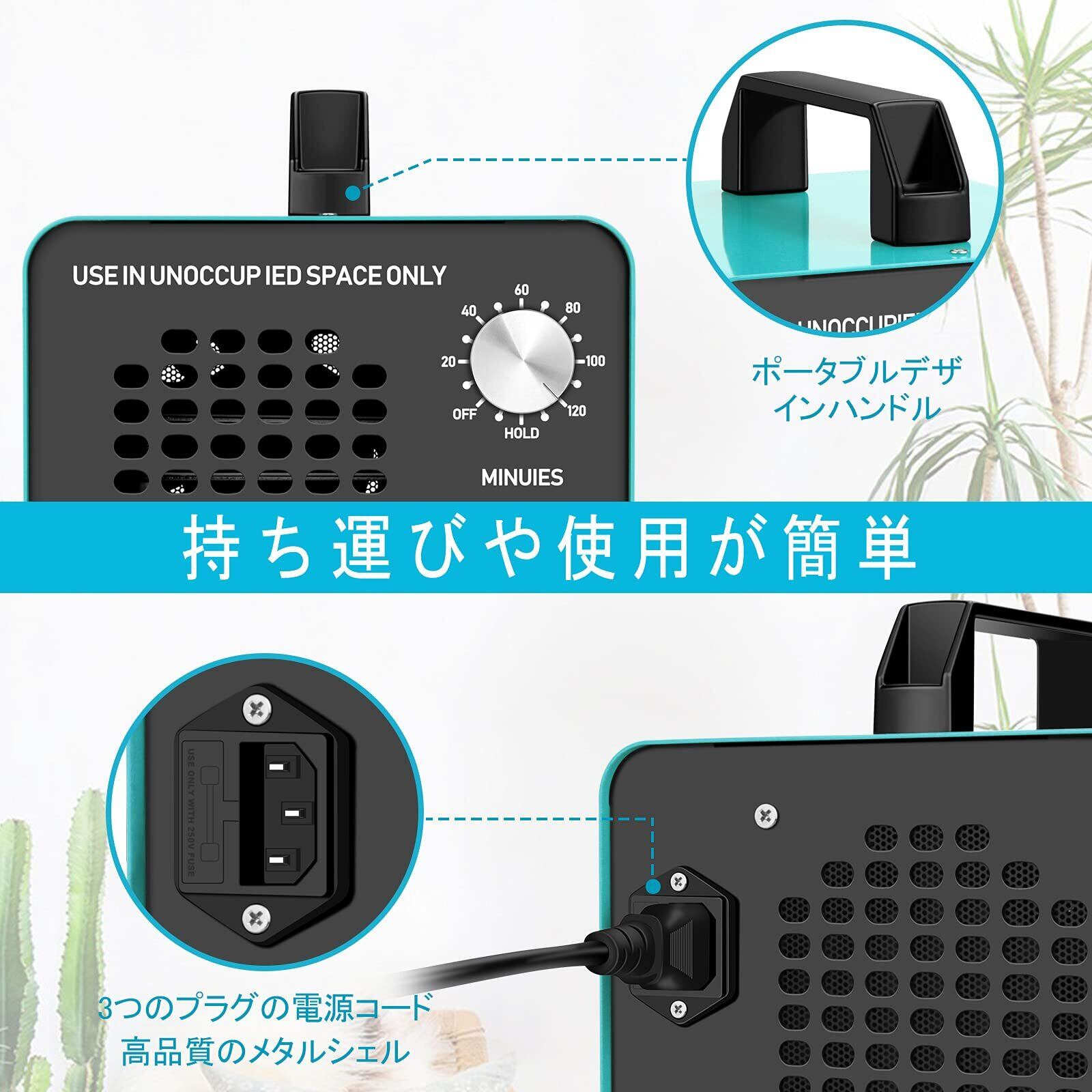 最大120分間で自動的にオフするタイマーを内蔵しており、また、ホールド機能付きなので、広い場所の脱臭において連続運転も可能です。この消臭器は、密閉された空間でのみ使用可能で消臭動作中、人は部屋には入らないでください。 ペットなどの動物も同様に入れません。