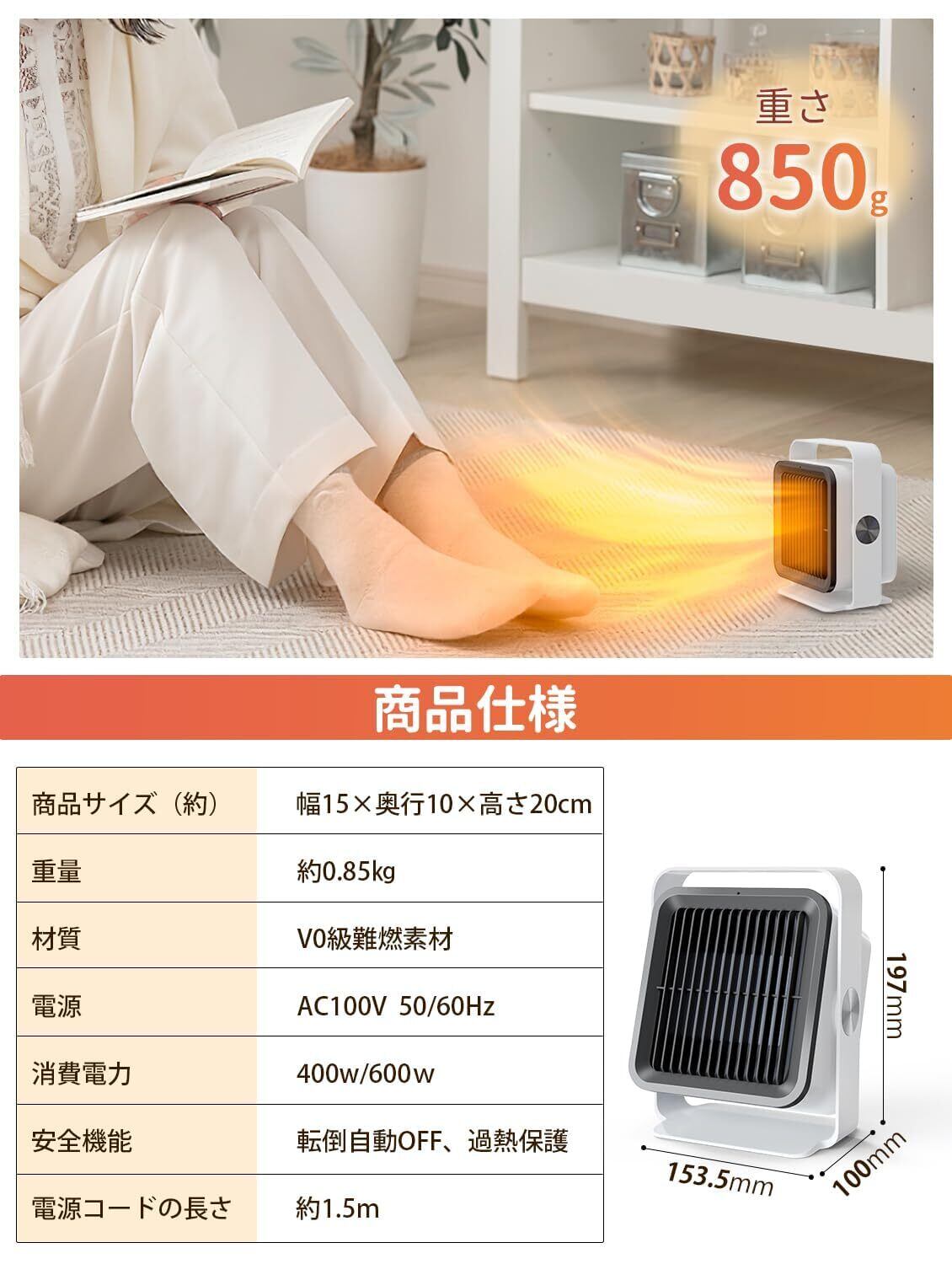 【商品仕様&安心】◆【人感センサー付き 小型セラミックファンヒーターが選ばれる理由】速暖:お部屋をすぐに暖かく。無臭:燃料を燃やさないので嫌な臭いがしない。無補充:電気発熱なので燃料を補充する必要なし。空気が汚れない:有毒な排気ガスが出ないのでこまめな換気の必要なし。◆本体サイズ:幅15×奥行10×高さ20cm、本体重量:850g、電源コードの長さ:1.5m、電源:交流100V(50/60Hz)、消費電力:600W/400w、1時間あたりの電気代目安:約10.8円※弱運転、電気料金目安単価27円/kWhを基に算出。人感センサー感知範囲:上下方向90°、左右方向90°、人感センサー感知距離:約4m。期間:お買い上げ日より1年間(の範囲については、書をご確認ください。(一般家庭用以外(業務用など)に使用された場合の故障及び損傷などは対象外となります))
