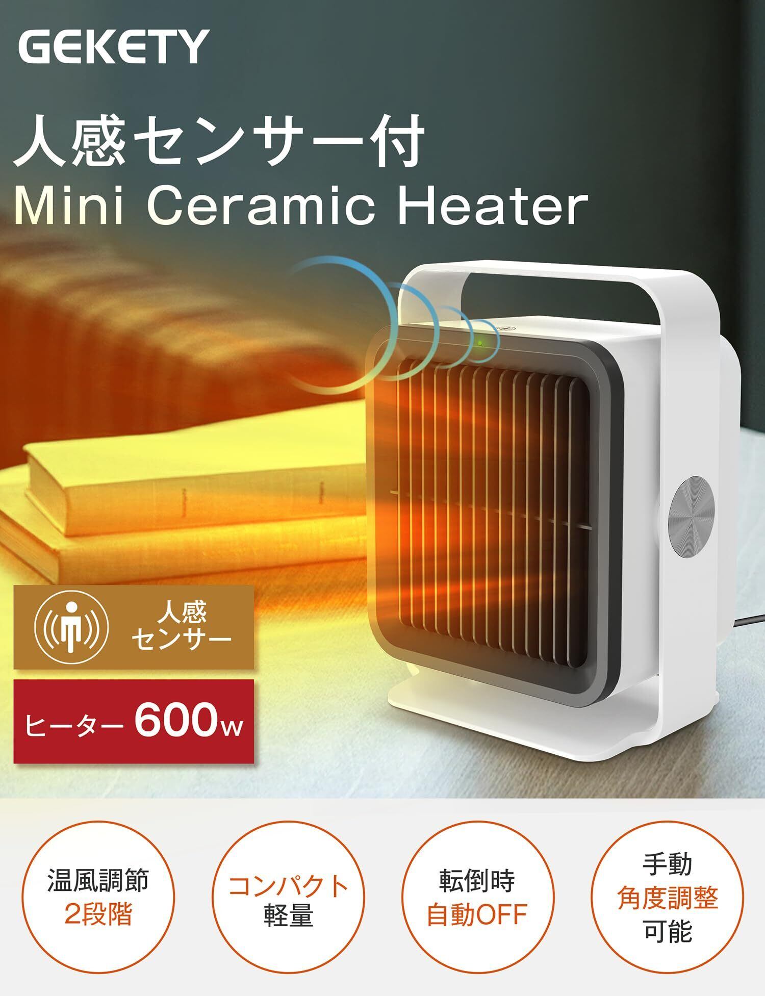 【小さいけれどハイパワー!暮らしに便利なミニヒーター】GEKETY人感センサー付小型セラミックファンヒーターは、スイッチを入れるとすぐに暖かい風が出てくる小型暖房器具。足元や狭い場所でのスポット暖房に最適。一人で使うのにピッタリなコンパクトサイズは、キッチン・トイレ・オフィスの足元など置き場所を選びません。小さなボディですが、600Wのハイパワーを実現。読書やお仕事中、寒さで冷えた体を足元からゆっくり温めてくれます。
