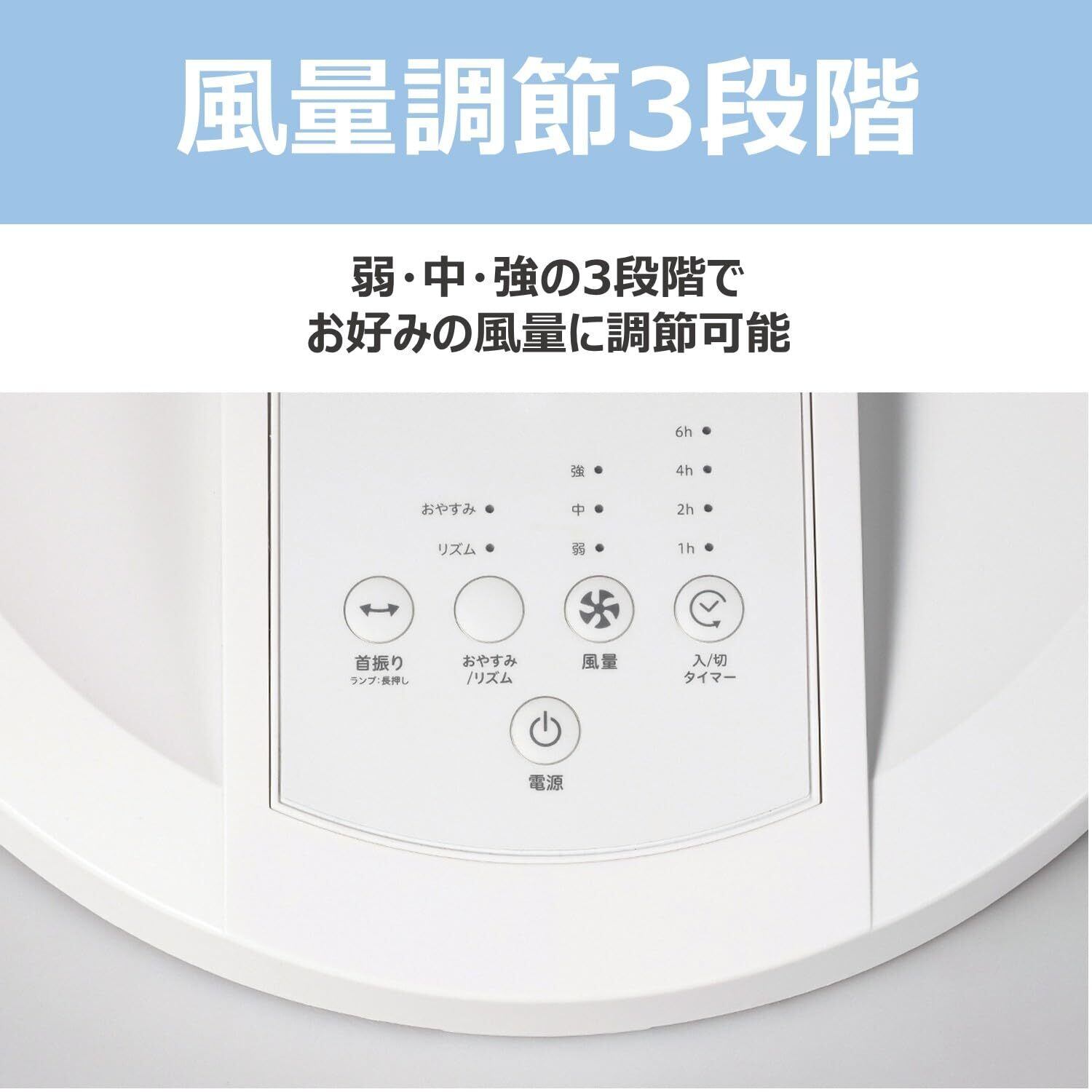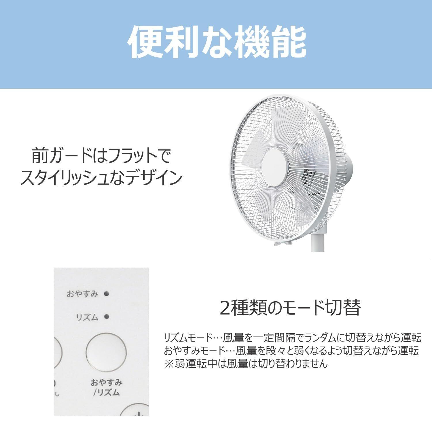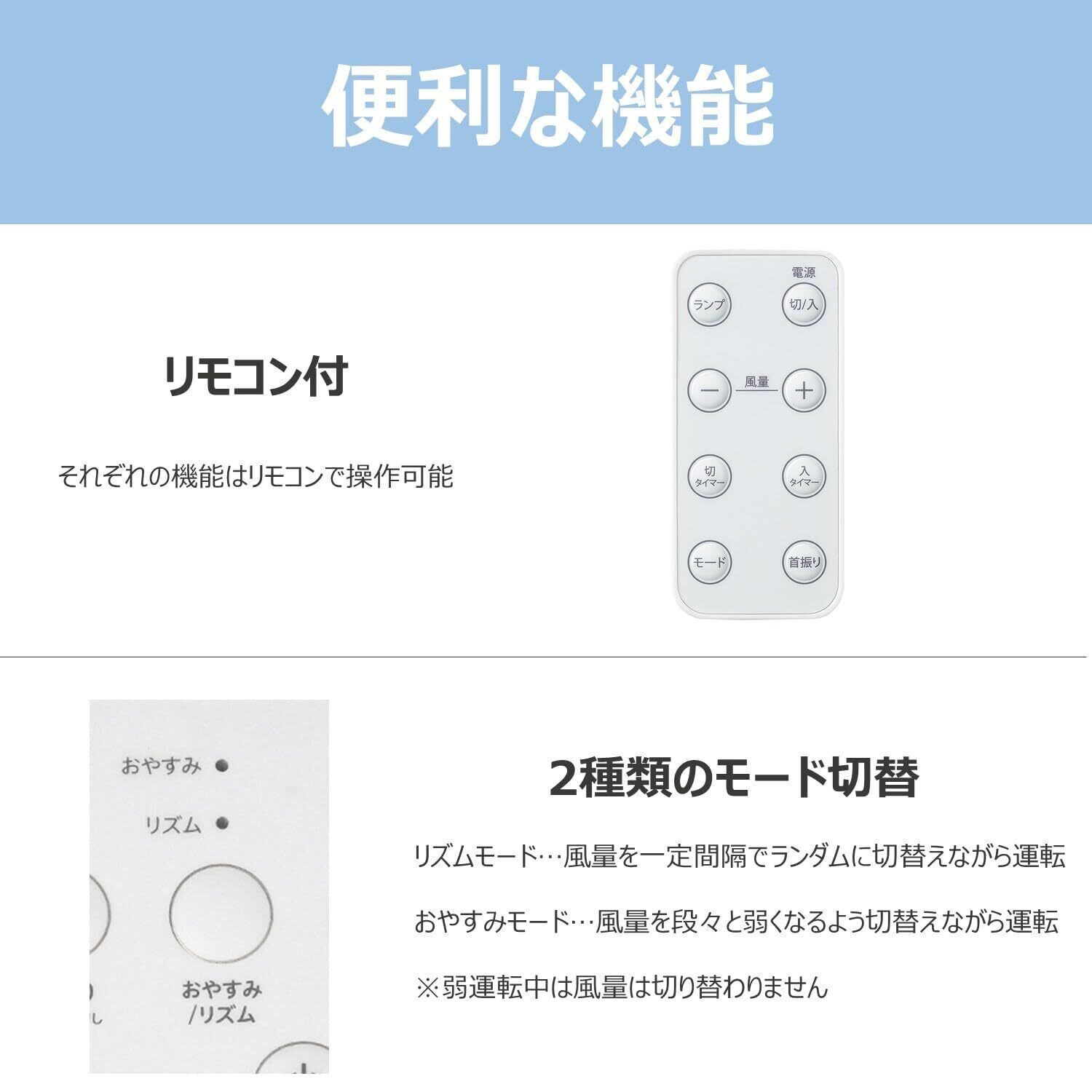 【2種類のモード切替】・リズムモード:風量を一定間隔でランダムに切替えながら運転 ・おやすみモード:風量を段々と弱くなるよう切替えながら運転