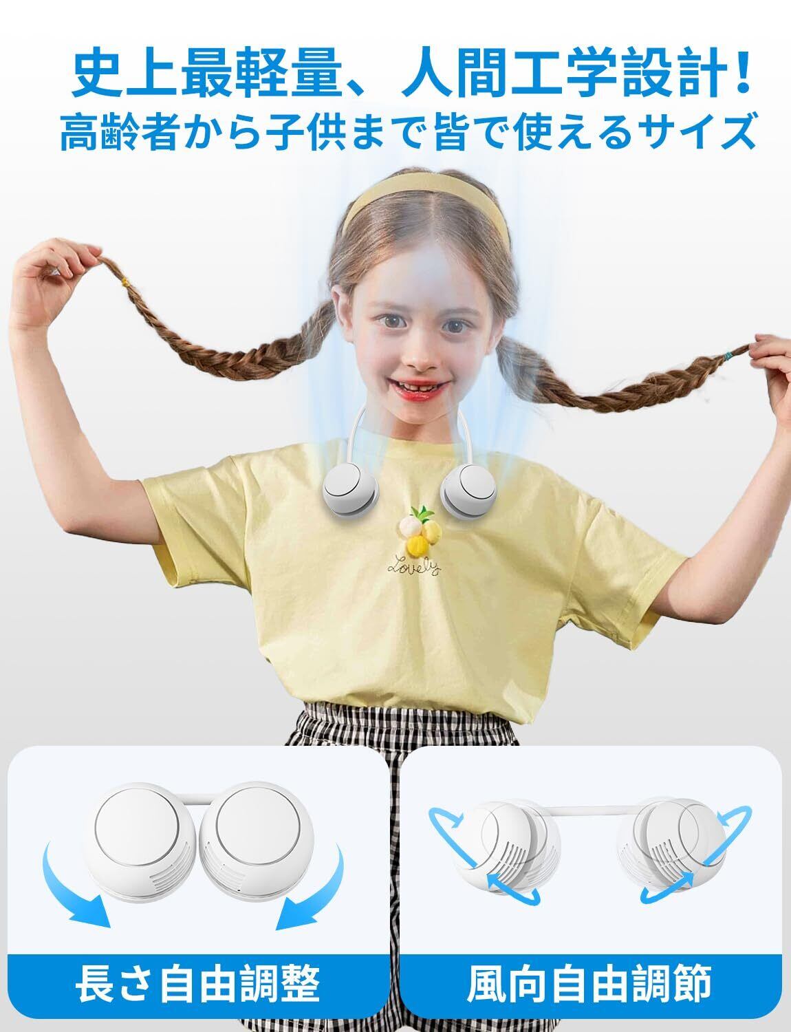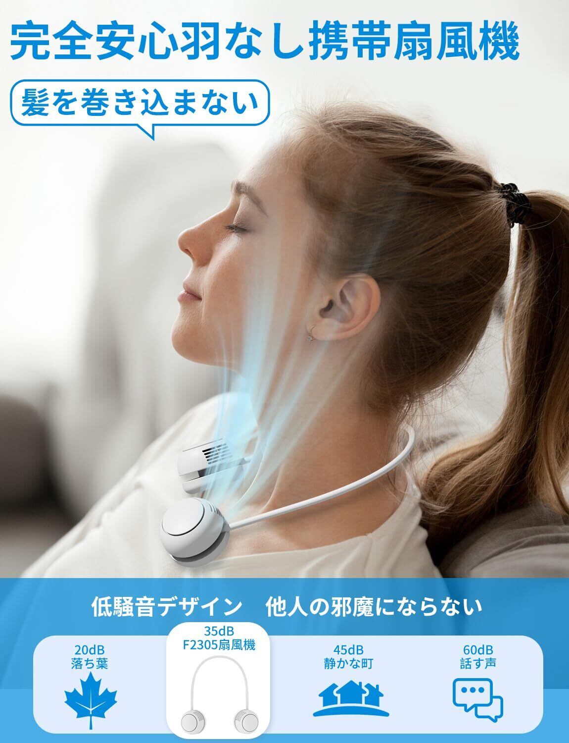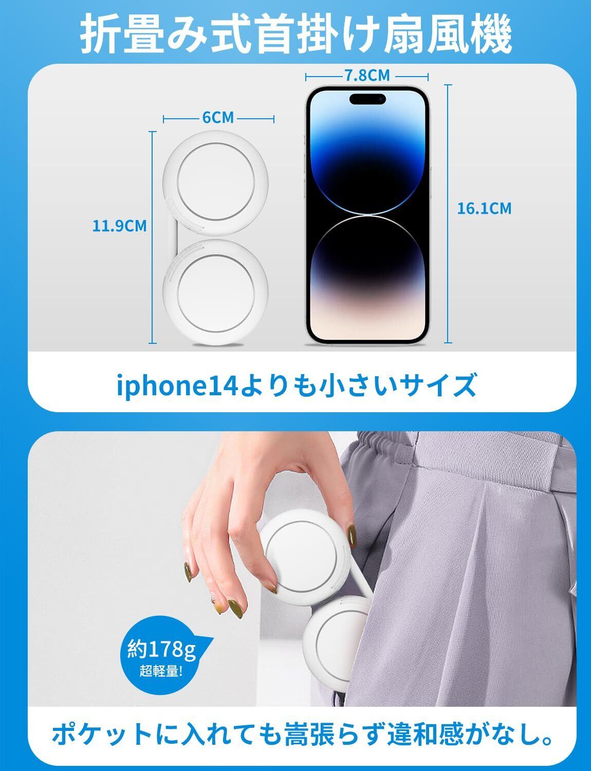 特徴 ①折り畳み首掛け②軽量178g③35dBの静音設計④省エネ設計⑤長時間使用⑥360°自由に角度調節⑦2000mAh容量バッテリー