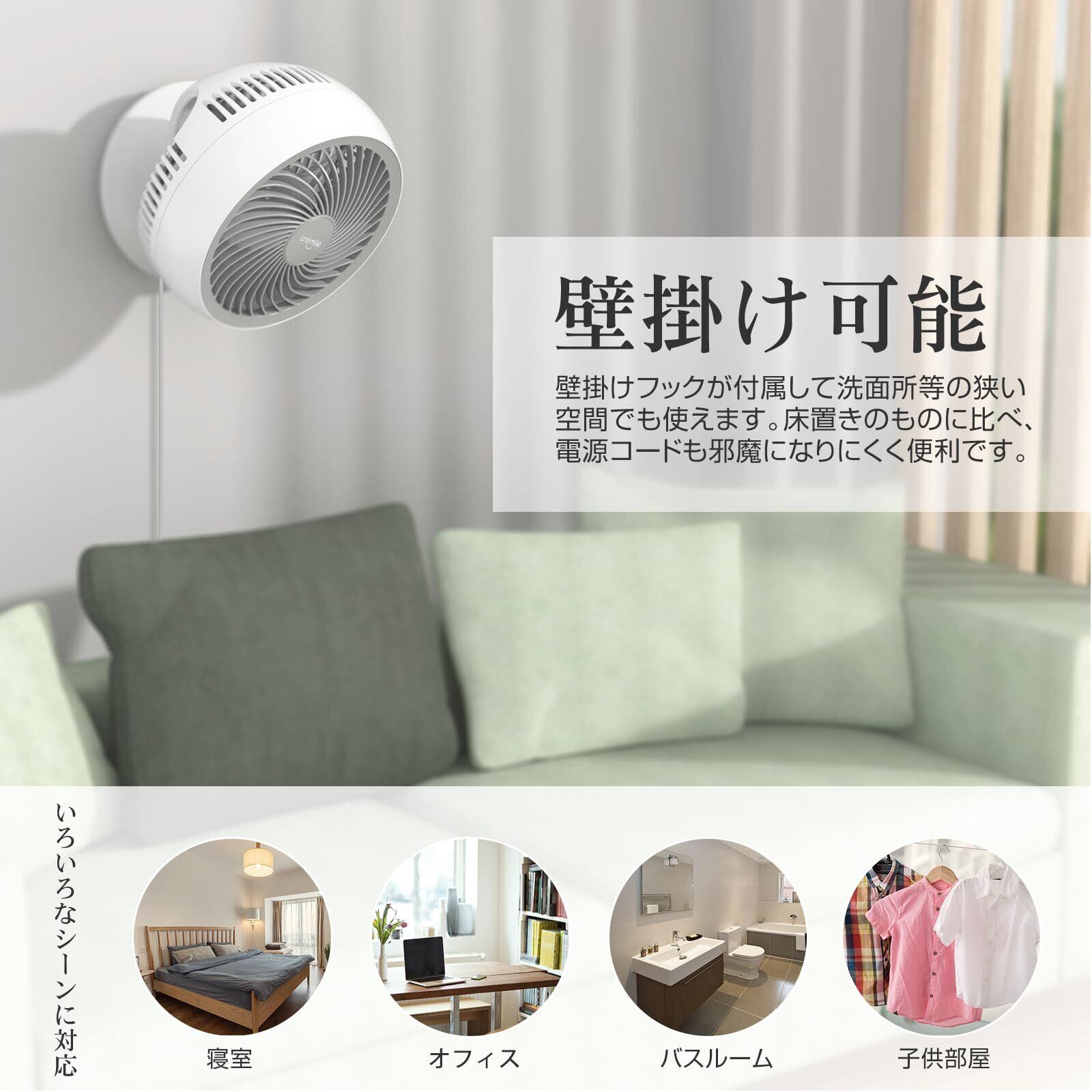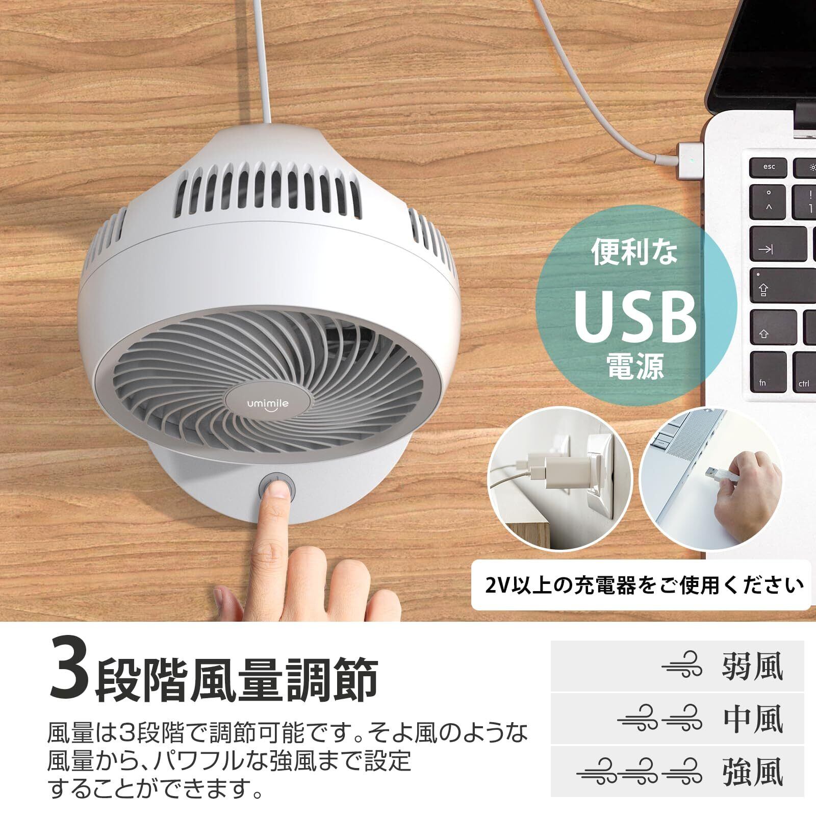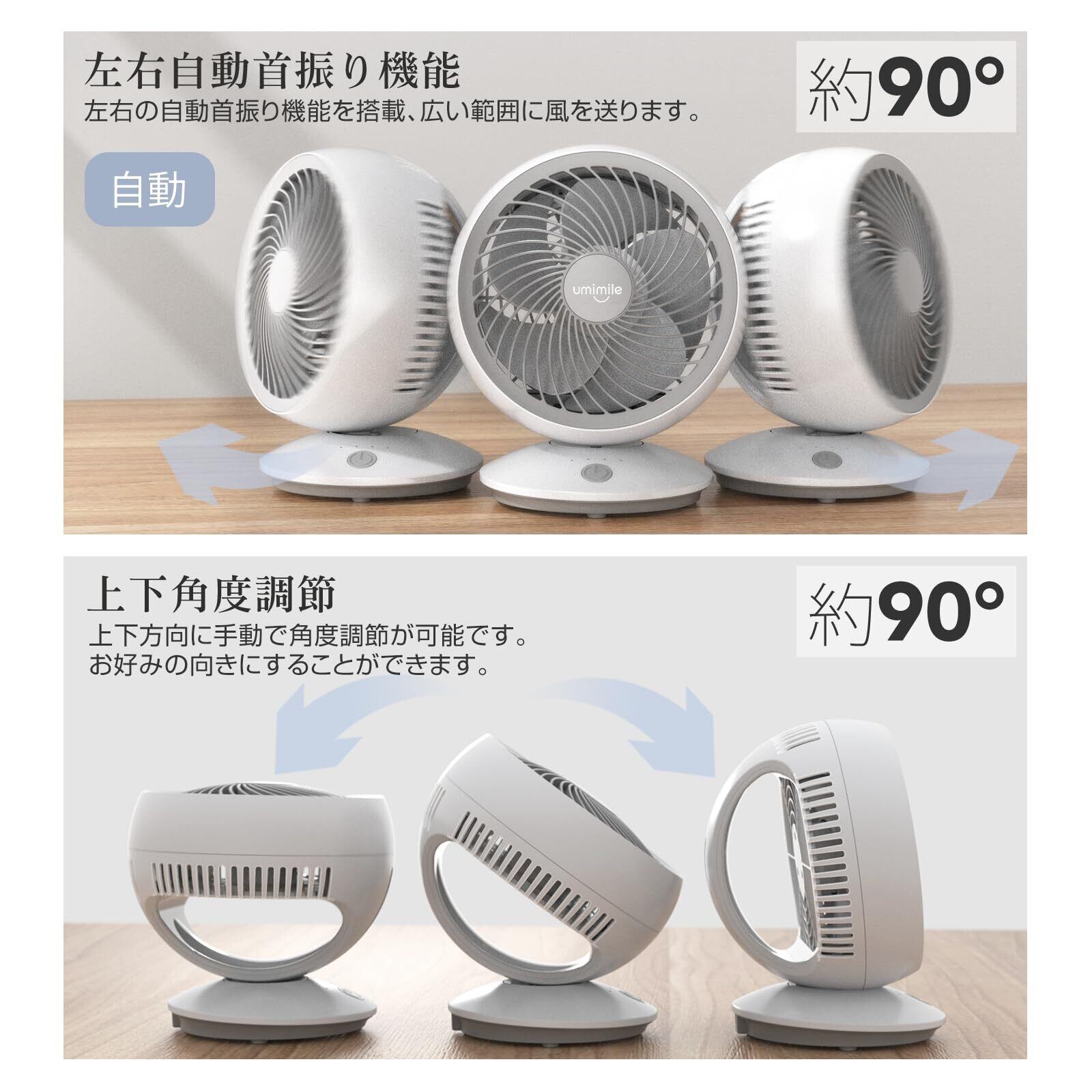 Umimileユミマイル サーキュレーター 首振り 静音 壁掛け 扇風機 小型 卓上 dcモーター 6畳 羽根径17cm 風量3段階調節 省エネ 5枚羽根 USB電源 グレー
