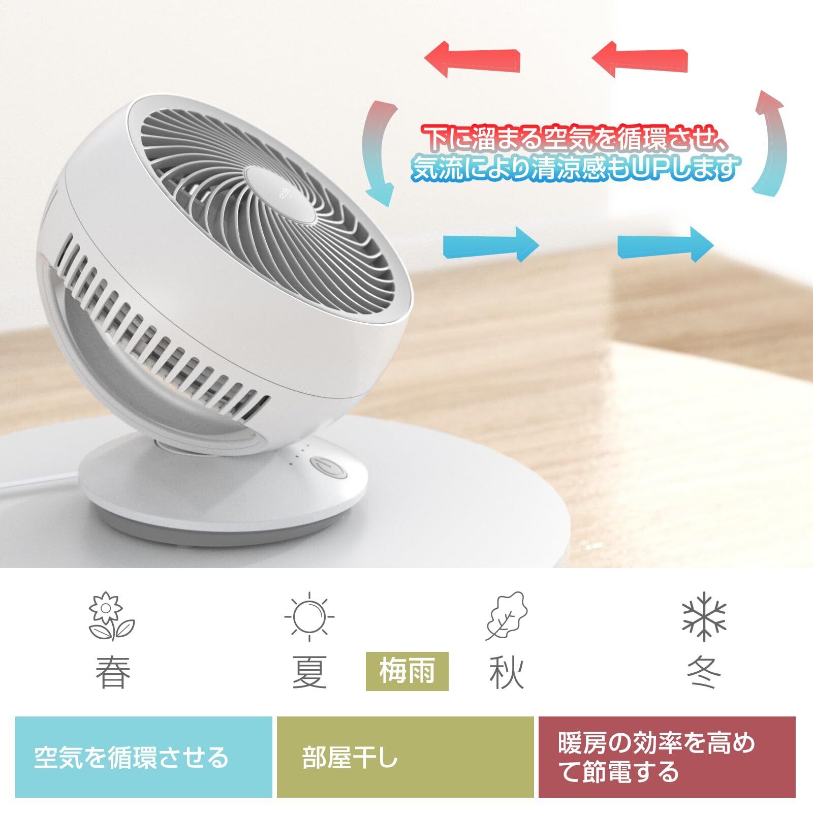 【コンパクトサイズながら清涼感抜群】:約20センチ四方のコンパクトサイズなので、狭い部屋にも、カウンターの上や棚の上などにも、置き場所を選ばずご使用頂けます。扇風機機能付きのサーキュレーターは、パワフルな風が部屋の空気を循環させ、清涼感アップ。エアコンと併用すれば、設定温度を抑えられるので節電につながります。