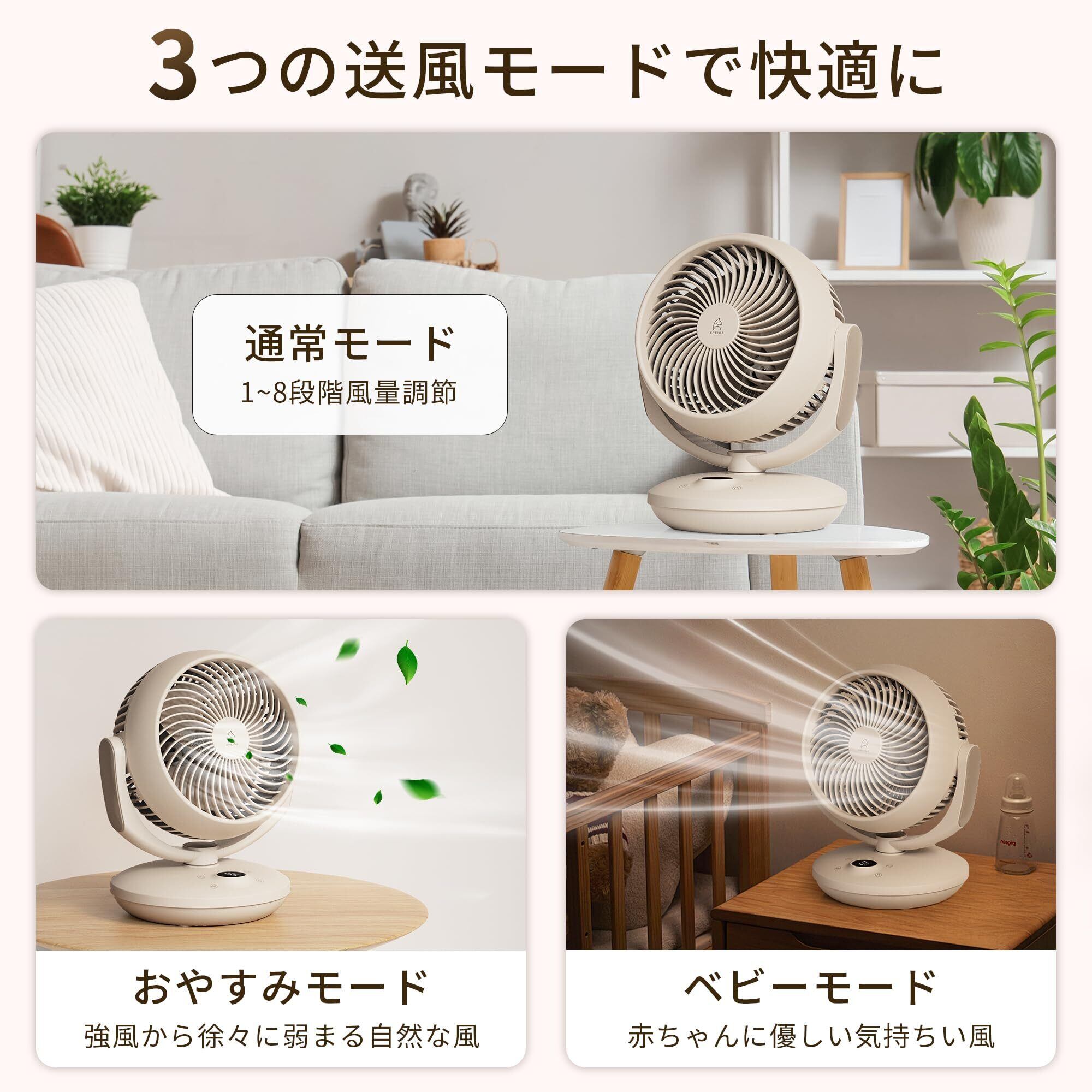【8段階風量& 3つの送風モードで風も気分に合わせて、自由自在】8段階の風量調整に加え、「通常モード」「おやすみモード」「ベビーモード」の3つの送風モードを搭載。やさしい風で眠りをサポートしたり、赤ちゃんの肌にやさしく届けたり、季節やシーンにぴったりな風を選べます。夏は空気を循環して冷房効率アップ、梅雨は部屋干し乾燥をサポート。1年中フル活用できる頼れる一台です。