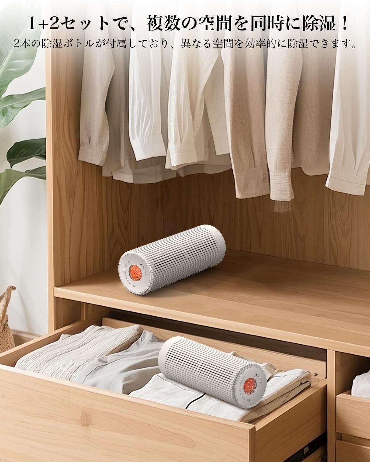 【1+2セットでさらに快適】除湿ボトル2本が含まれており、異なる空間を効率的に除湿できます。1本あたり最大で100mlの水分を吸収、約3畳の面積に対応可能です。
