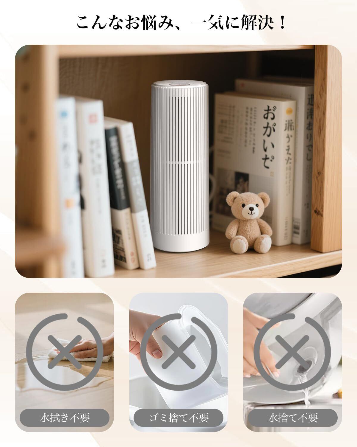 【お手入れ不要でラクラク】ゴミも水も出さない環境に優しい除湿機ですので、水を捨てたり、拭き取ったり、ゴミを処理したりする手間がかからず、快適にお使いいただけます。