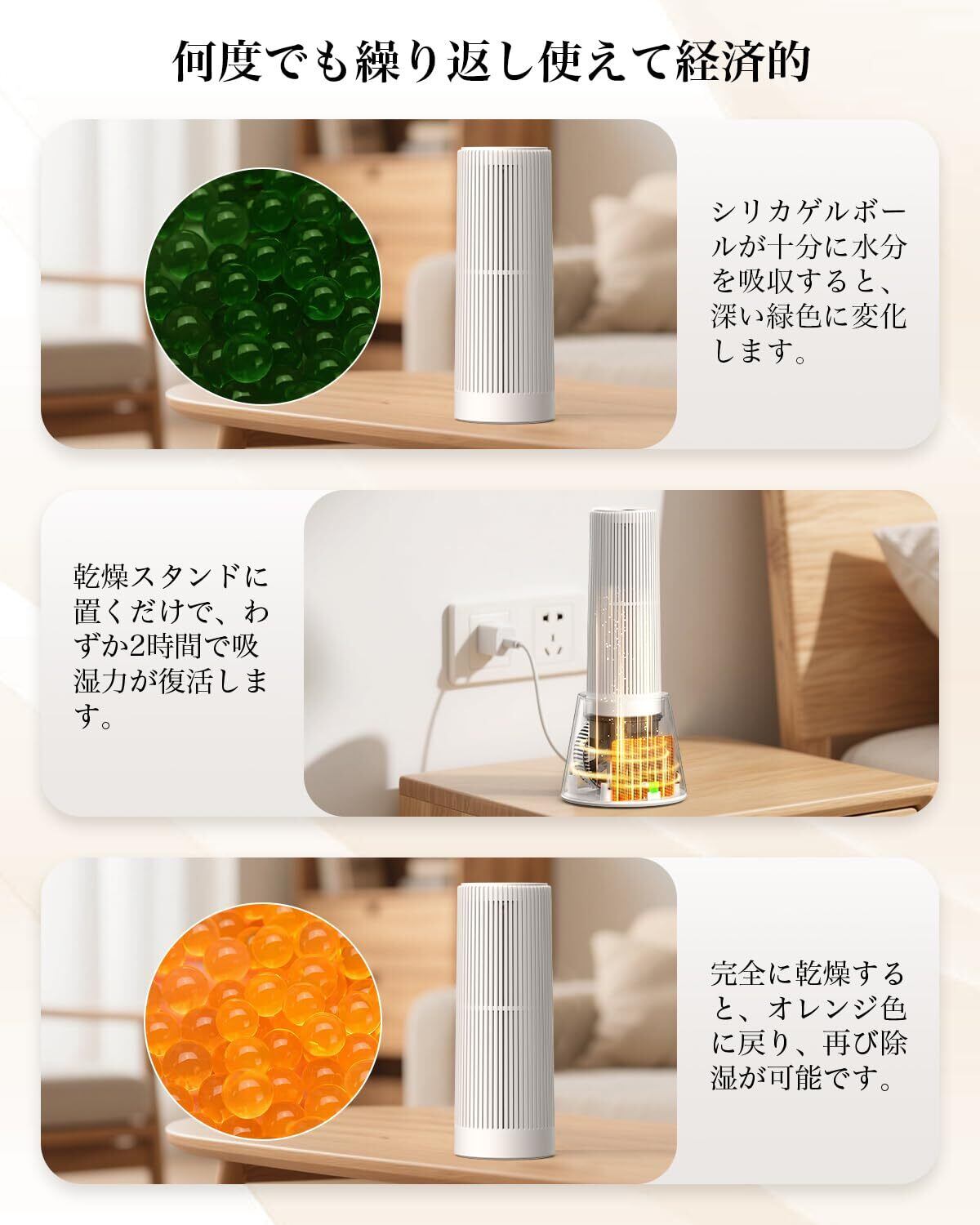 【見える除湿で安心】透明な窓から見える色の変化で、現在の除湿状況を確認できます:オレンジ色(乾燥中)→ 緑色(湿気吸収中)→ 深い緑色(完全に水分吸収済み)。