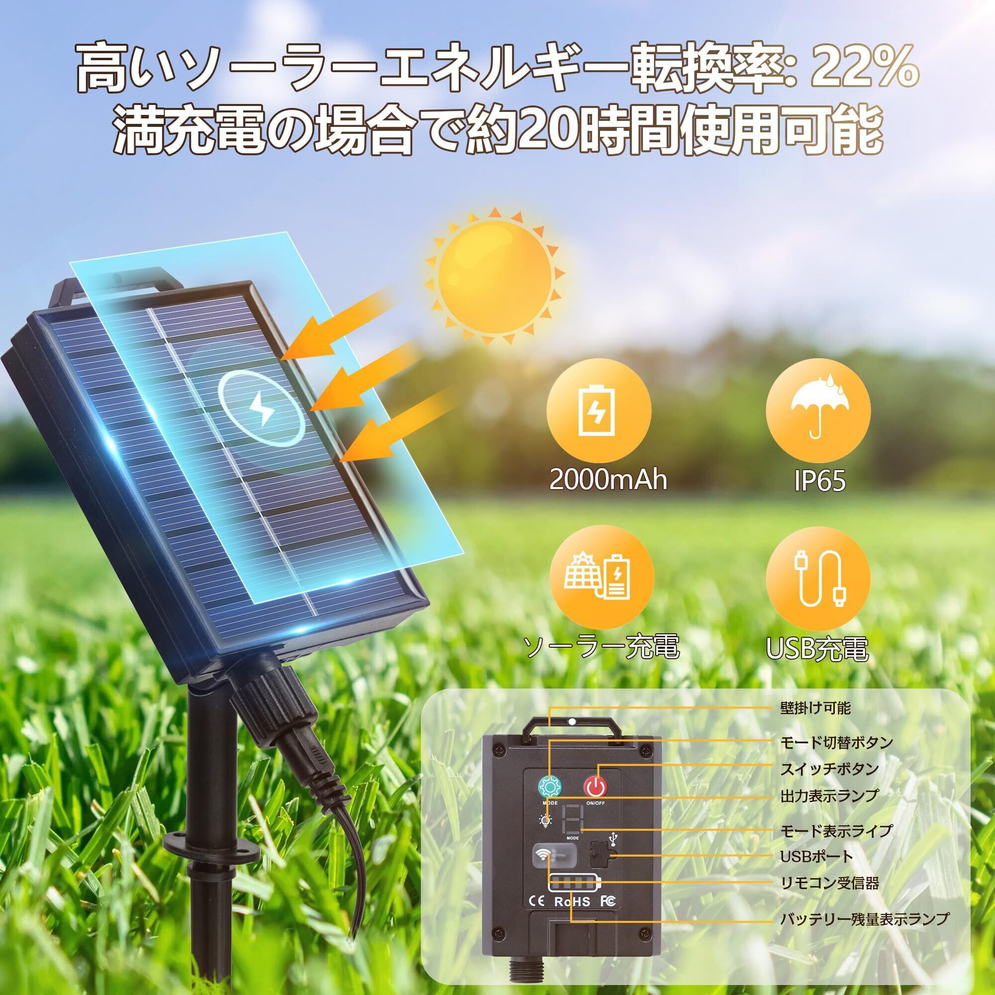 〖防水&取り付け簡単〗:LEDストリングライトはIP44の防水電球とIP65のソーラーパネルを採用し、悪天候でも安心して使用できる。太陽光ストリングライトは180°調整可能なソーラーパネルを装備し、ソーラーパネルは2000 mAh大容量充電可能電池を内蔵し、太陽光パネルを直射日光に曝すだけで、太陽光を電気エネルギーに変換することができ、環境に優しい照明方式である。