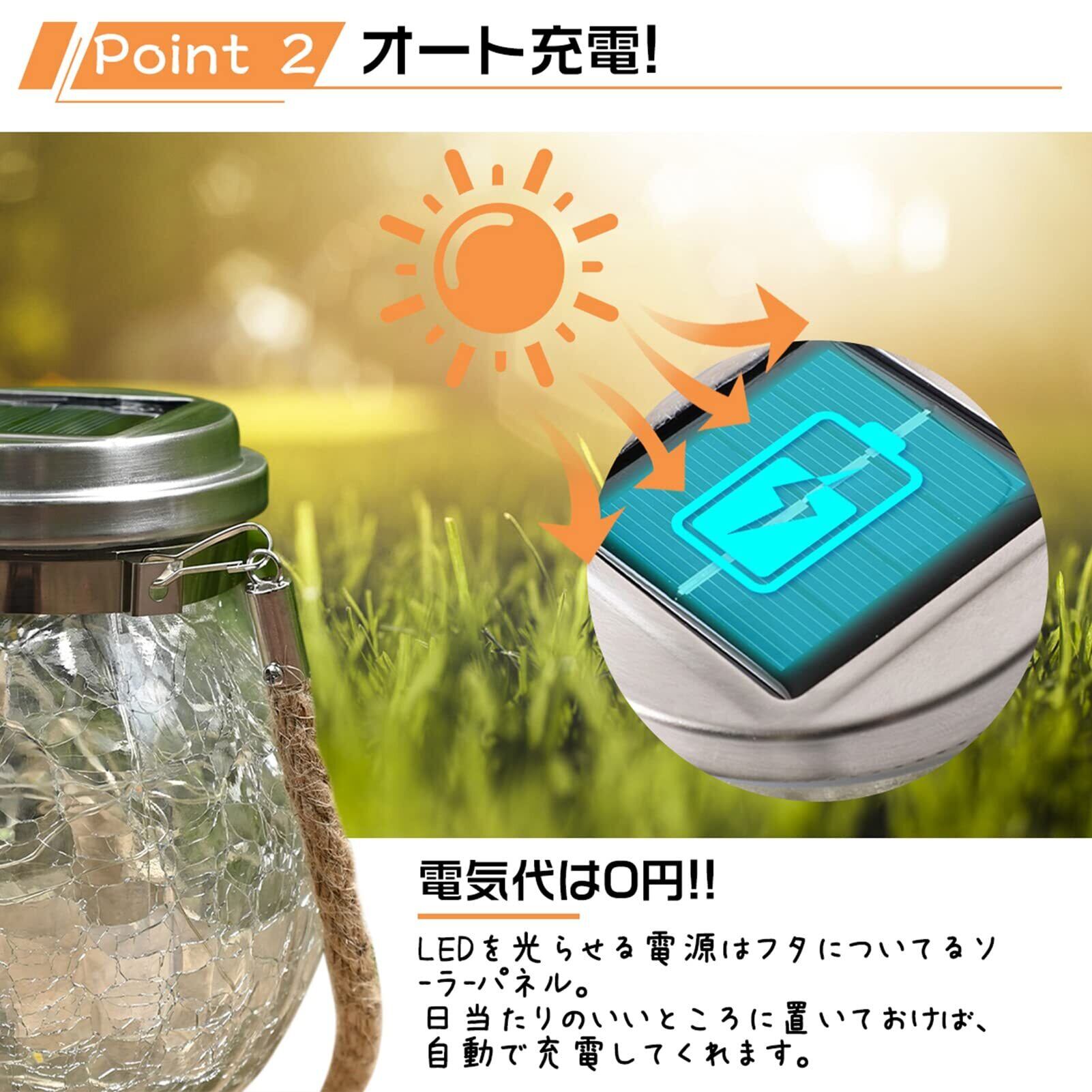【暖色ソーラーライト】梱包内容:ソーラーライト×2、日本語説明書×1; 充電時間:6-8時間; 照明時間:8-12時間; ※充電時間と照明時間は天候によって変わります ※ご使用する前に必ずスイッチをオンにしてください。