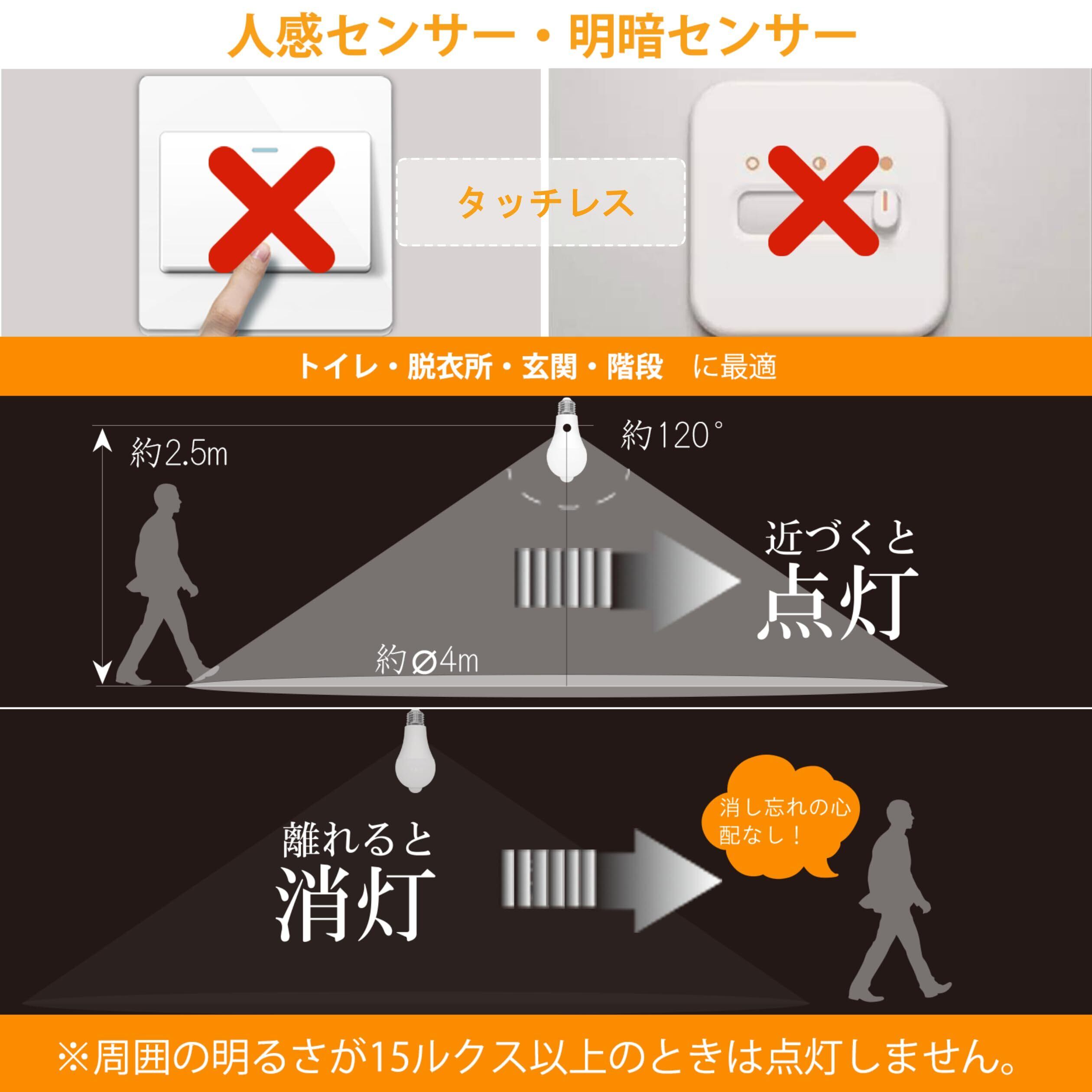【自動点灯・自動消灯】人感センサー搭載のLED電球。人の動きを検知して自動で点灯します。人の動きがなくなると約120秒後に自動消灯します。消し忘れの手間や夜間の点灯の不便を解消。ご注意:人・動物などが動きを検知し続けると、ライトが点灯し続ける。途中で暗くなってしまう心配がない。