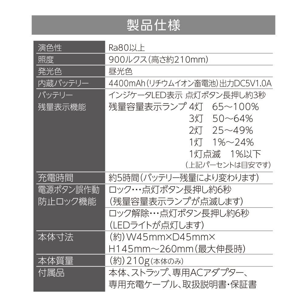 明るさ・照度:140lm(ルーメン)・3段階調光可能、900ルクス(高さ210mm)、内蔵バッテリー:リチウムイオン蓄電池 3.7V 4400mAh(内蔵電池容量)、USB端子出力:DC5V 1A