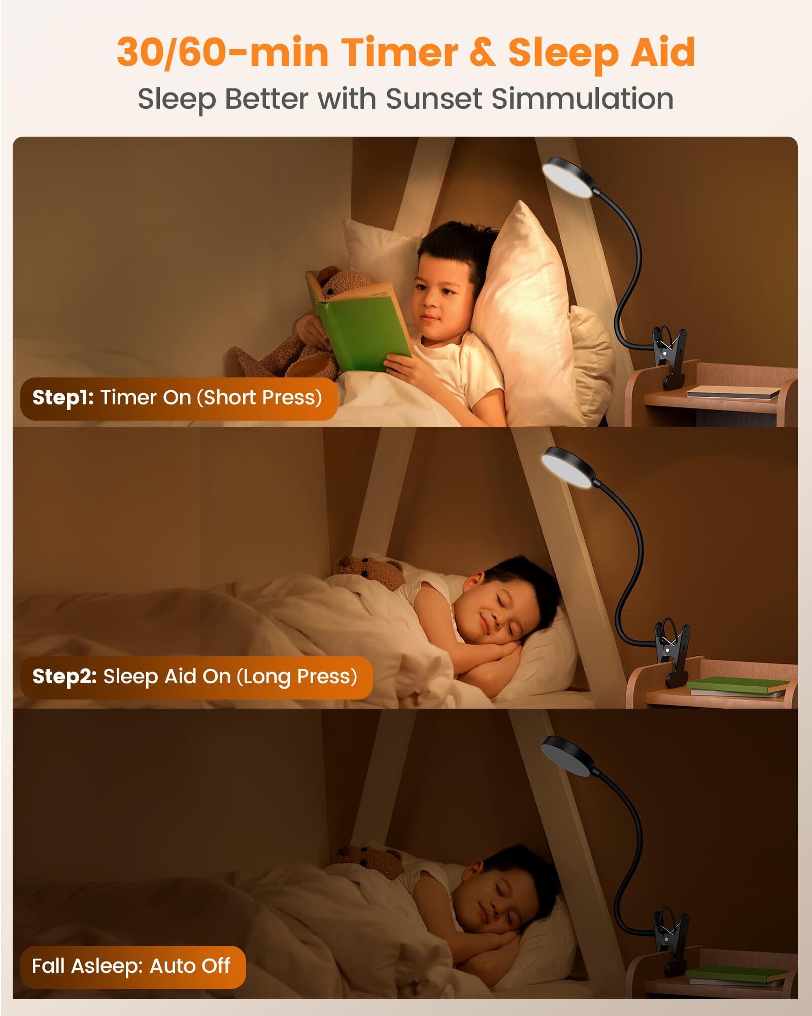 【ナイトライト&タイマー付き】やさしいアンバー色のナイトライトモードを搭載。お子様の就寝時や夜間の読書にも安心です。30分/60分の自動オフタイマー機能により、寝落ちしても安心の設計。読書灯 ベッドでの使用に最適で、睡眠導入をサポートする照明としてもおすすめ。物理ボタンと液晶画面による直感的な操作で、誰でも簡単に使えます。