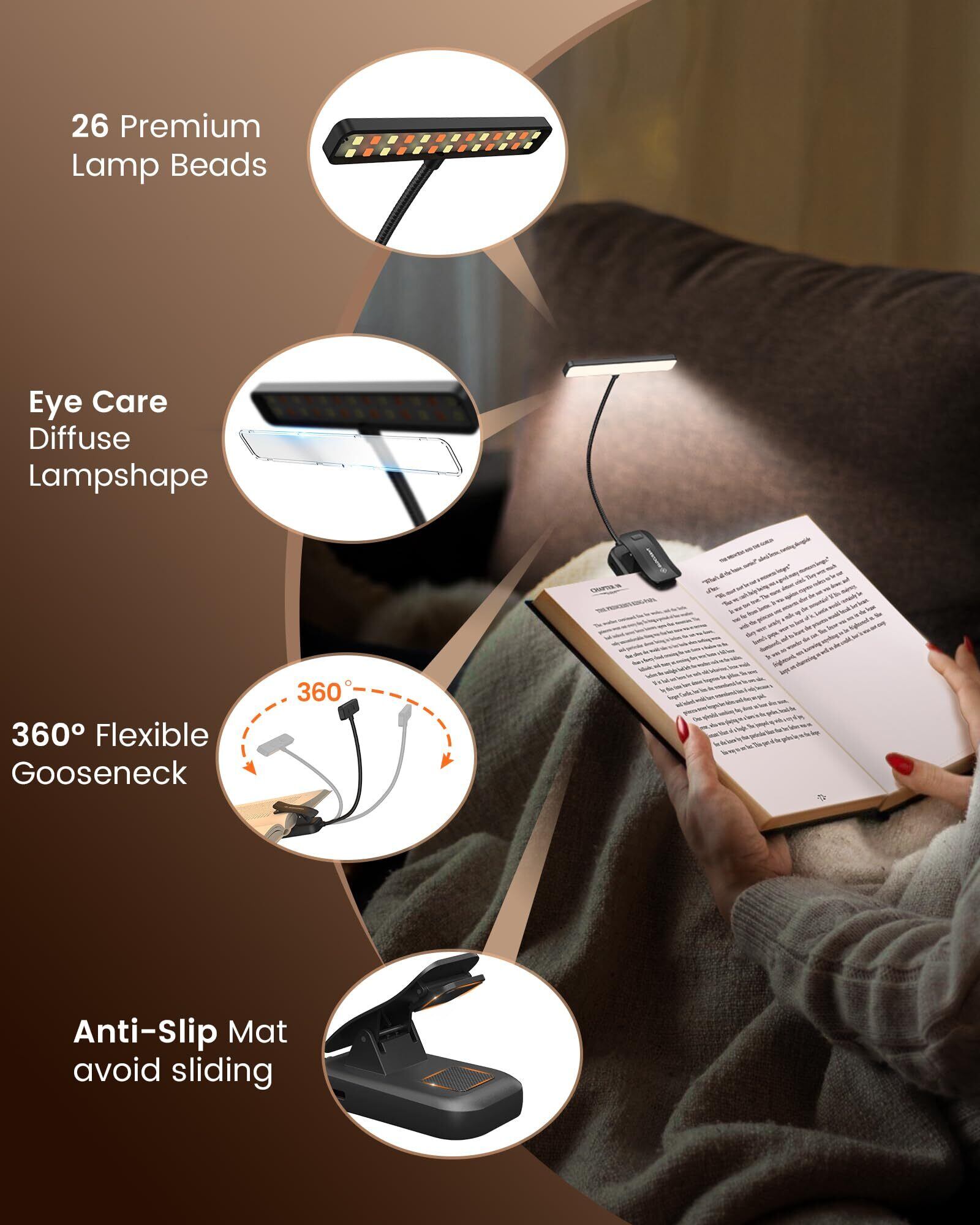 Glocusent 読書灯 クリップライト 26個LED搭載 5色温&無段階調光 長持ちバッテリー 寝ながら読書に最適なブックライト 充電式クリップ式ライト ベッド読書 ギフト 母の日 父の日 敬老の日