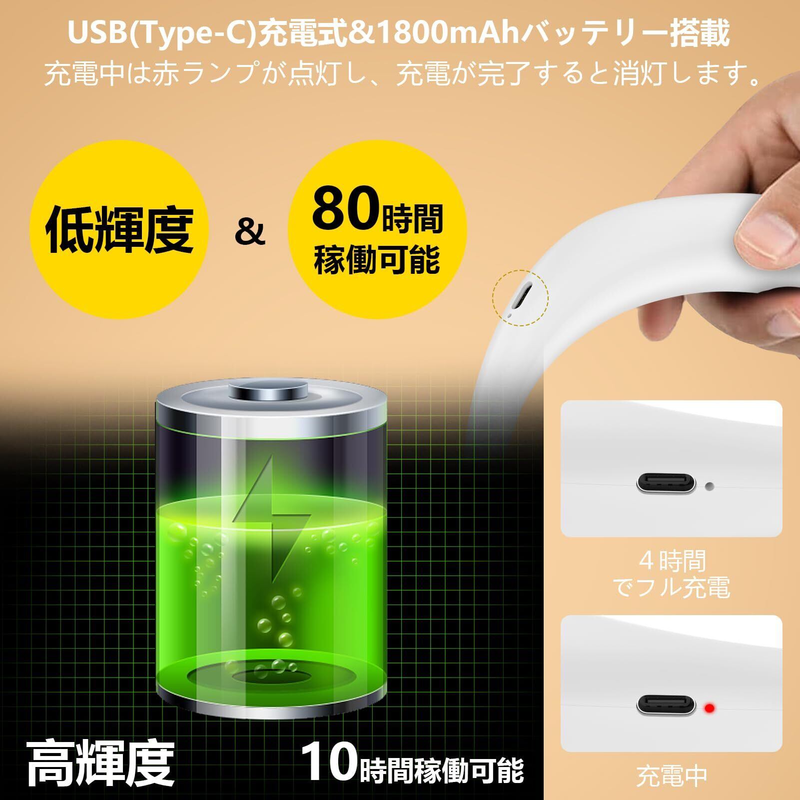 【USB充電式&長時間使用可能】USB充電式で、パソコンやモバイルバッテリーなどのUSBポートから充電可能です。1800mAhの内蔵バッテリーにより、フル充電後約10時間連続使用できます。長時間の読書やデスクワークにも最適なコンパクト読書ライトです。