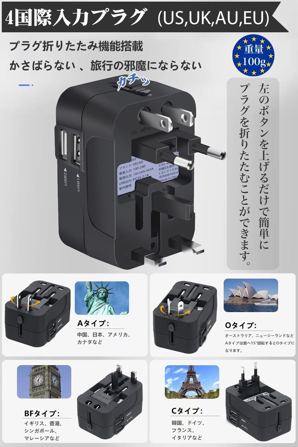 【コンパクトで軽く】この電源変換プラグは小型軽量で、サイズは77×50×39mm、重さは約91gで、また、4種類のプラグ部分を折りたたんで収納でき、場所をとらず、カバンに直接入れても重さも気にせず、旅行の際の持ち運びにとても便利です。海外旅行、出張、留学に最適です。