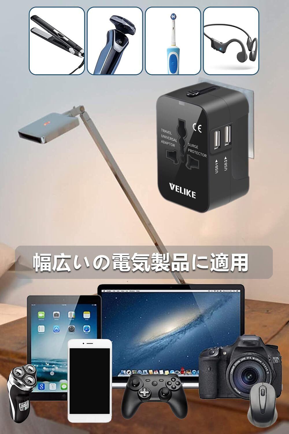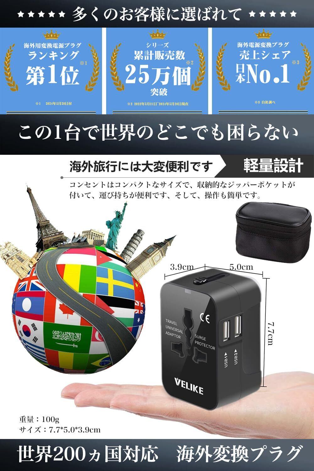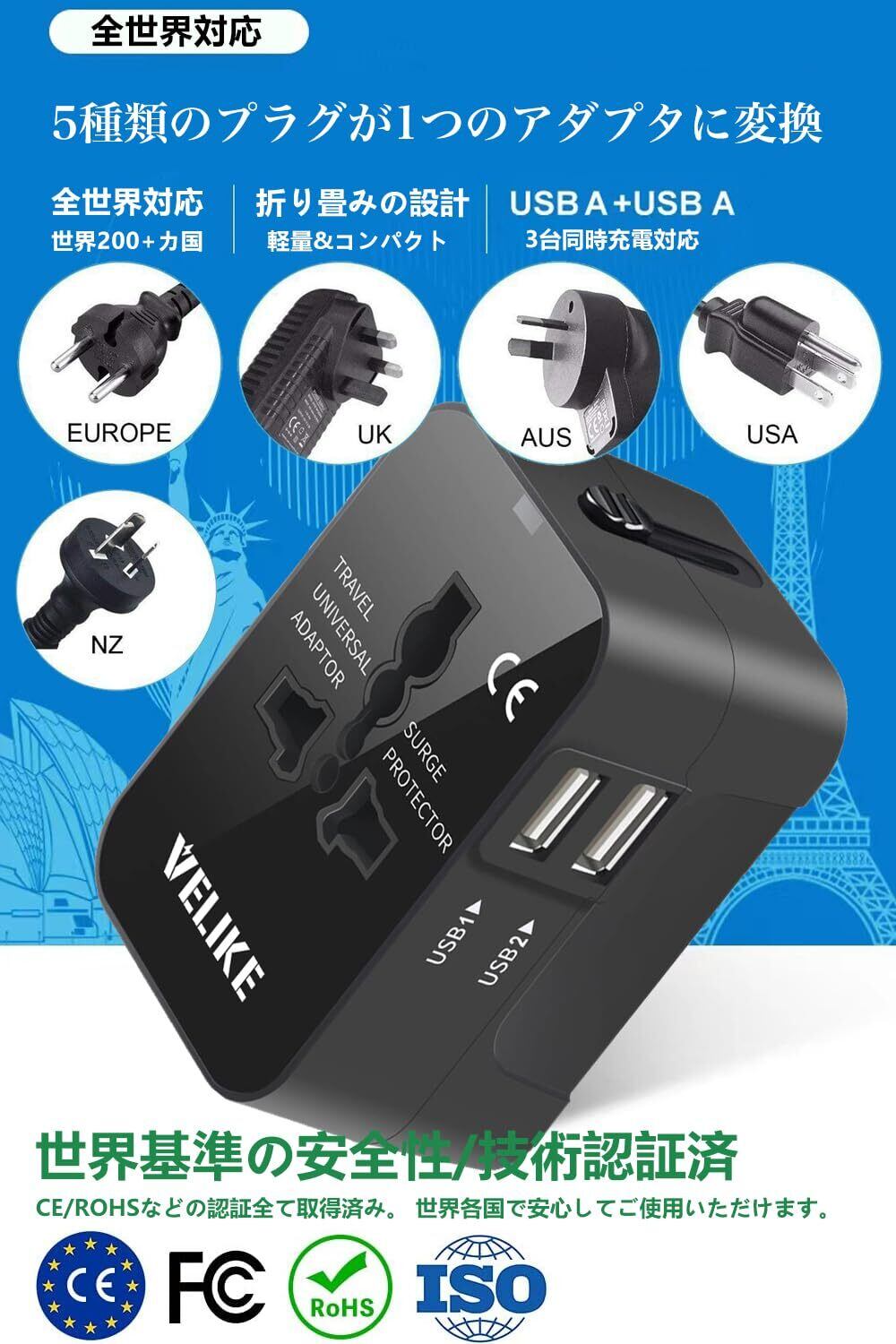 VELIKE 海外 変換プラグ コンセント 海外用電源プラグ マルチ変換プラグ 2USBポート 全世界対応 変換器 海外旅行用充電器 A/O/BF/Cタイプ マルチアダプター 200ヶ国以上通用 Universal Travel Adapter 経済産業省承認済み 正規1年