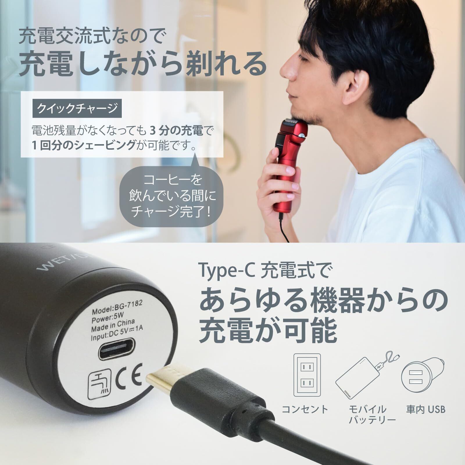 【クイックチャージ&ACパワーチャージ】電池残量がなくなっても3分の充電で1回分(5分)使用可能な急速バッテリーチャージ!充電を忘れてしまった忙しい朝でも安心してシェービング!フル充電で約1.5時間使用可能。Type-Cの交流充電タイプのバッテリーなので、充電しながらでも使用可能!(入浴中やウェット剃り中は充電しないで下さい。