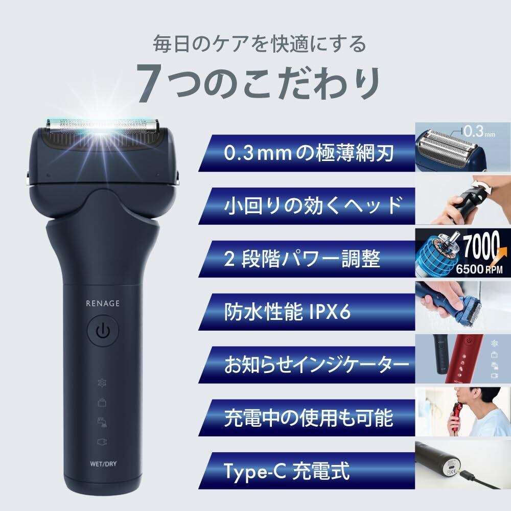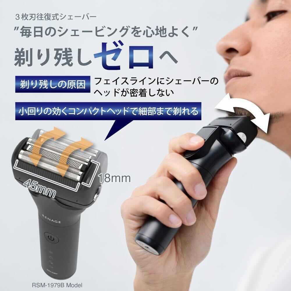 ひげそり 電動シェーバー メンズ 3枚刃 髭剃り 往復式 シェーバー IPX6防水 RENAGE Type-Cタイプ 急速充電 お知らせランプ 丸洗い可 ロック機能付き 密着ヘッド トリマー付き 自立キャップ付き パワー調整機能 深剃り ドライ剃り ウェット剃り(ブラック)