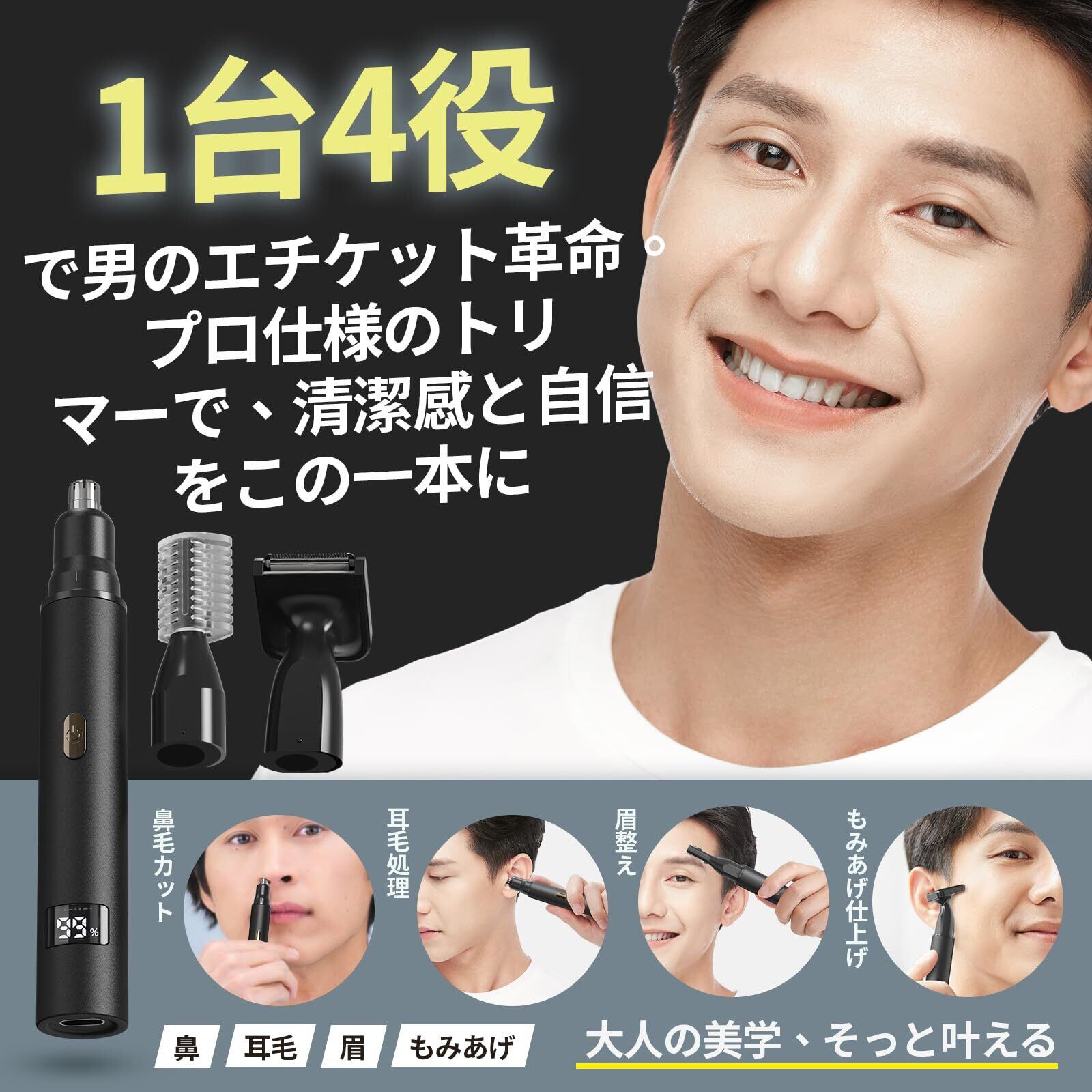 1台4役・男女兼用エチケットカッター:鼻毛カッター・眉毛シェーバー・耳毛トリマー・もみあげトリマーとして使える交換式ヘッド付き。立体円柱型の鼻毛用ヘッドは、丸みを帯びた先端で鼻腔を傷つけず、はなげきりばさみや鼻毛 ハサミの代わりに安全でスムーズな処理が可能。眉毛シェーバーは2mm・17mm対応で、初心者でも簡単にまゆげカット。耳毛処理や顔剃りにも対応、レディース・メンズ兼用の多機能設計。