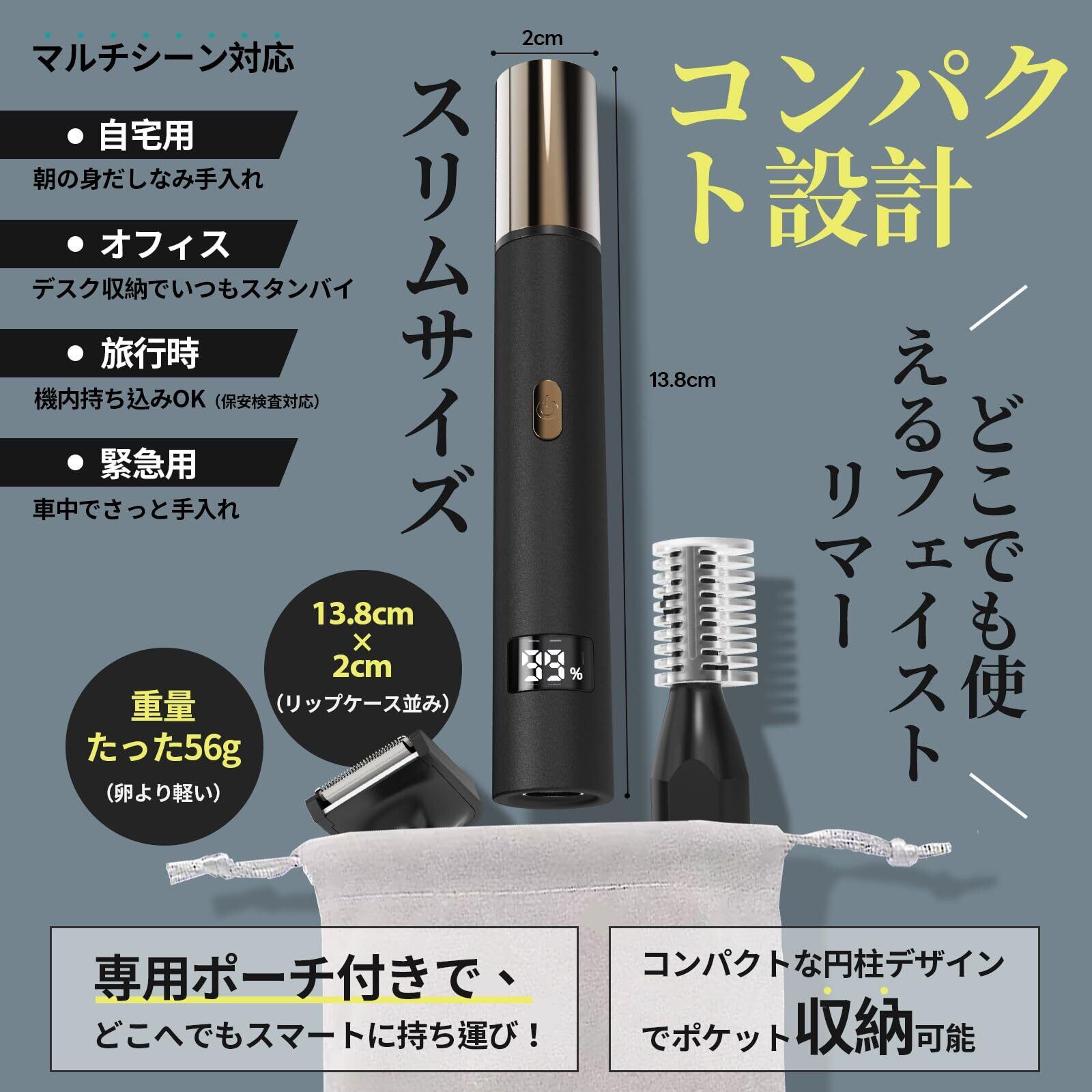 スリム&軽量、持ち運びに便利:本体サイズは直径20mm・長さ138mm、重さわずか56g。指紋の付きにくいマットボディで、しっかり握れるデザイン。専用収納ポーチ付きで、出張・旅行・オフィスでもスマートにエチケットケアが可能です。