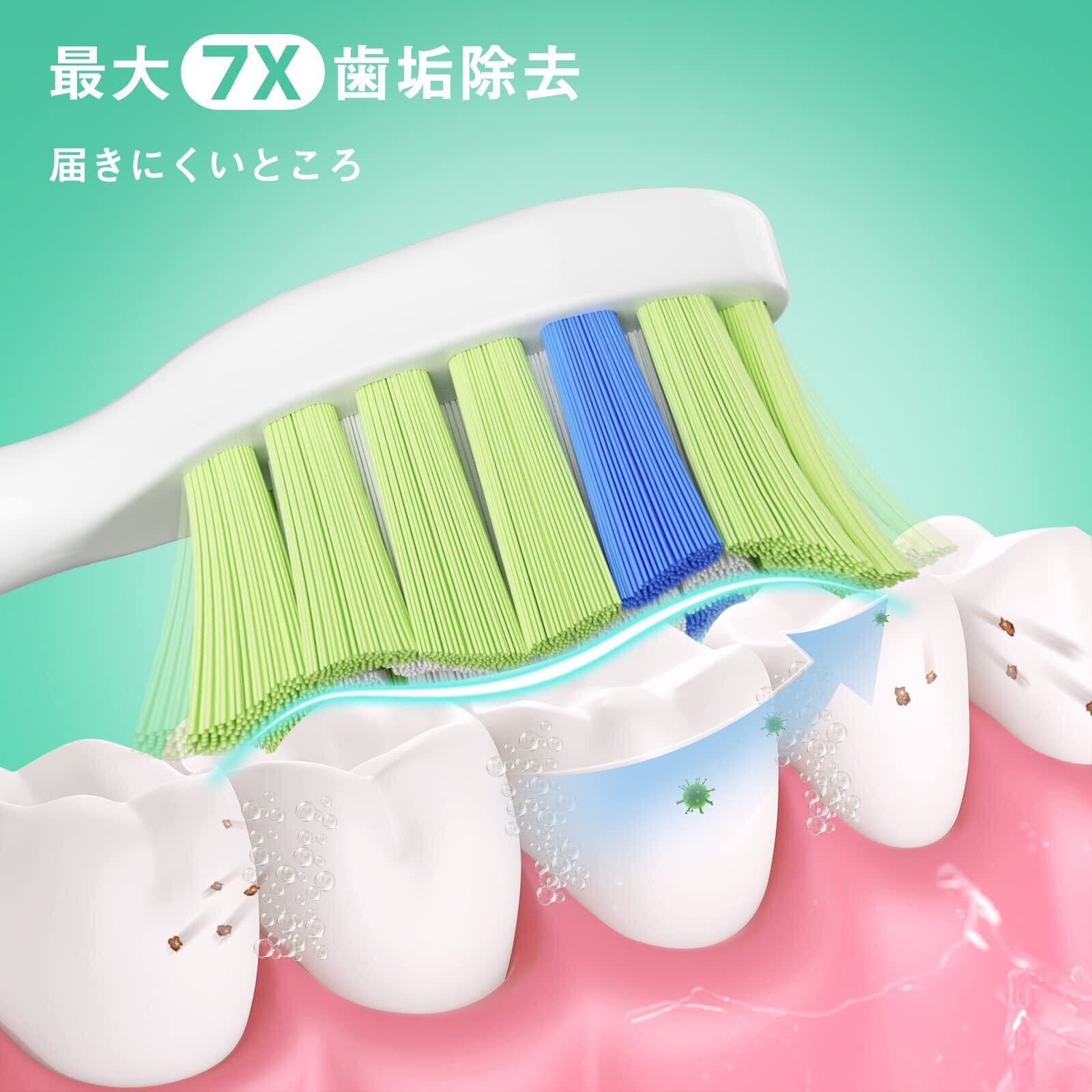 【効率的に歯垢を除去】毛が密集したソニッケアー 互換のブラシヘッドは、表面の7倍の歯垢を簡単に取り除きるだけなく、湾曲した毛先の設計により、届きにくい部分をしっかり歯垢を除去、歯肉炎を防ぎます。また、振動と幅広い振幅の組み合わせにより、歯垢を分解し、歯をきれいにする! より健康に、より白く