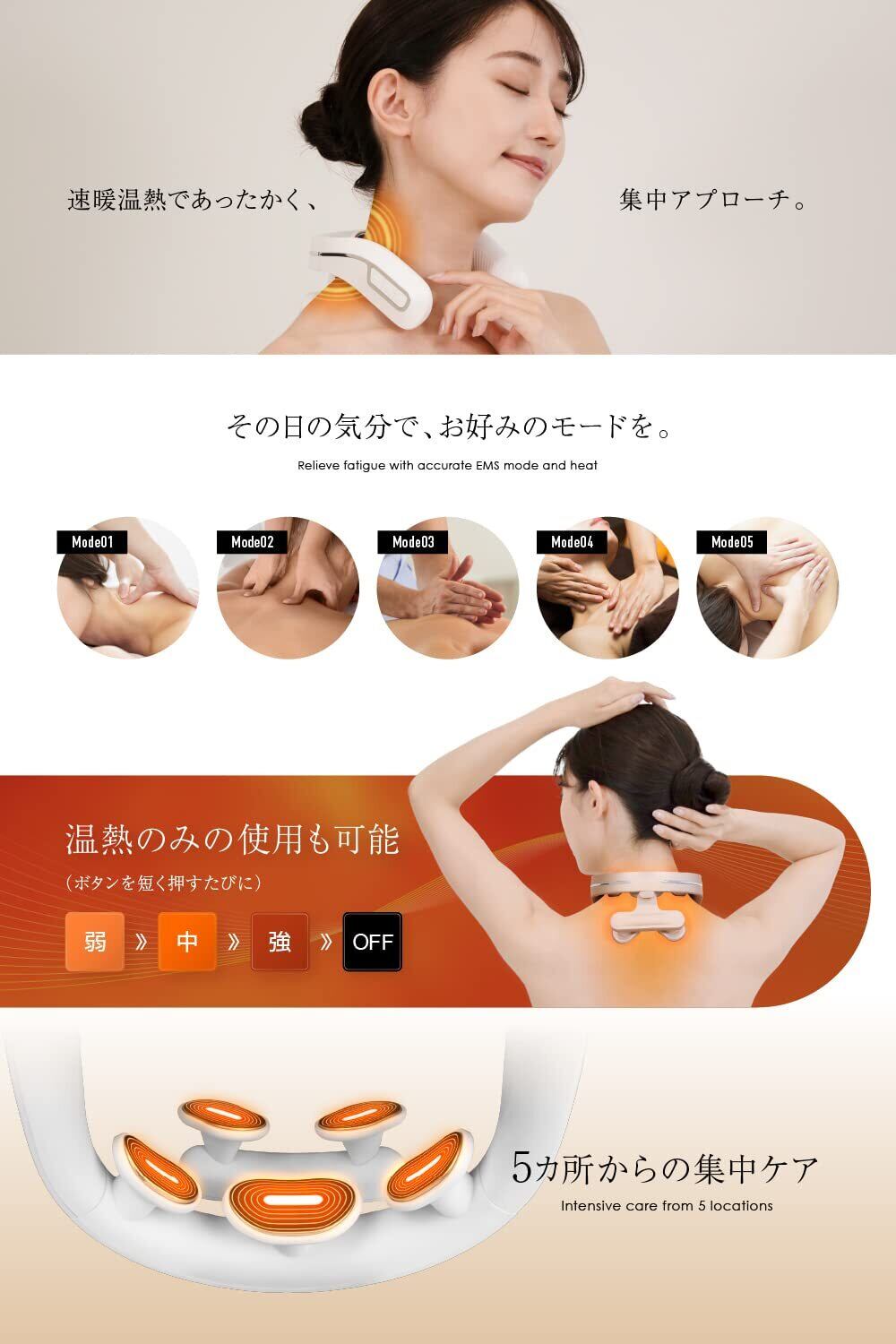 【5種類のEMSモード/15段階パワフルパワー/3段階の温熱レベル】異なった5種類のEMSモードから選択でき、強さレベルは、レベル1 〜レベル15までございます。 【EMSモード変更の手順】電源が入った状態で(三)ボタンを押すごとにモードが変わり、パワーは0から始まります。(+)ボタンを押して強さレベルを上げてください。(+)ボタンを押す度に強くなり、(-)ボタンを押す度に弱くなります。 【3段階の温熱レベル】弱:約37-39℃ 中:約39-41℃ 強:約41-43℃(III)ボタンを押すと温度が変わります。※温熱のみでの使用も可能です。