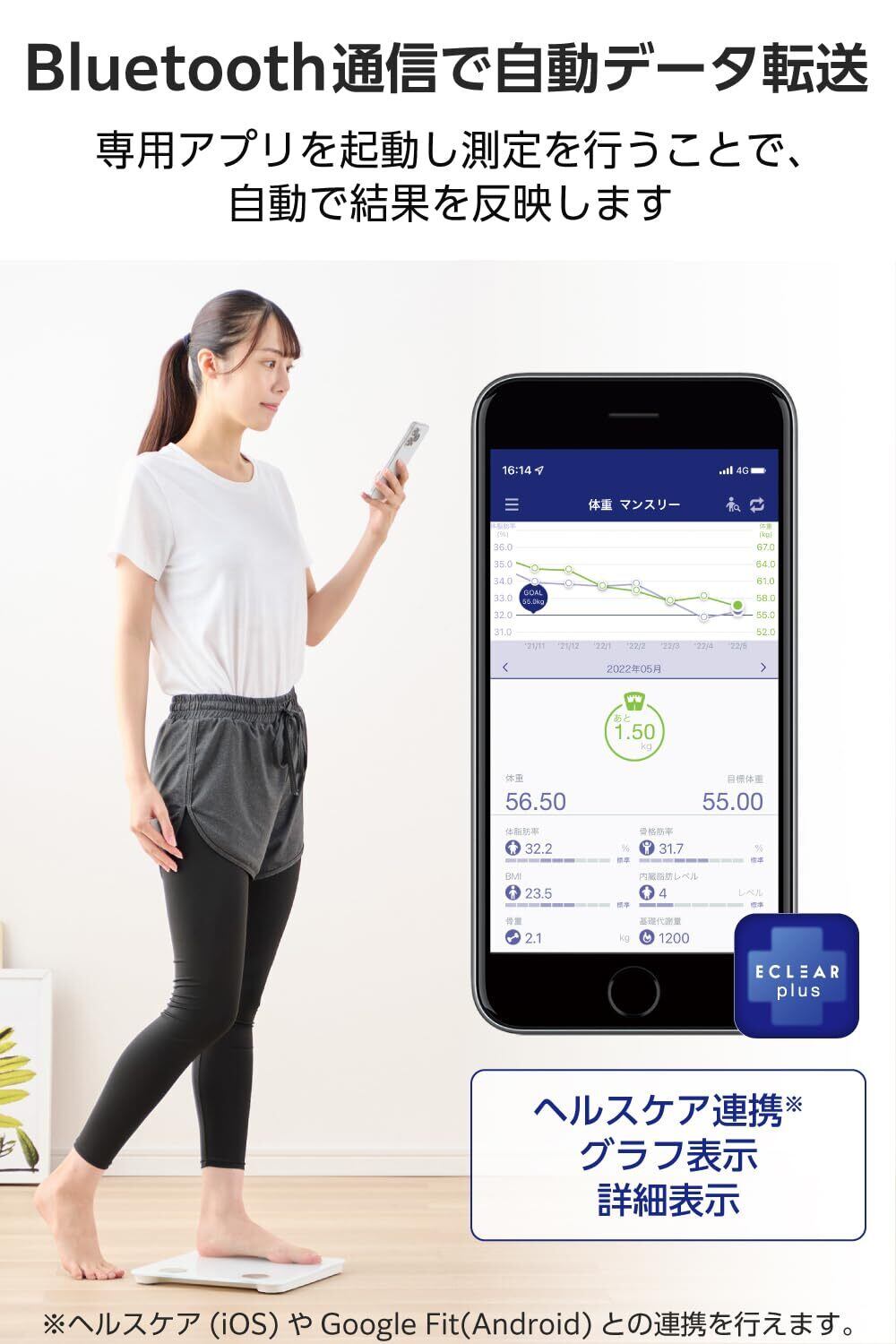 ■測定データを専用アプリ「ELECOM Healthcare」に転送できる、Bluetooth(R)通信機能搭載“エクリア 体組成計"です。