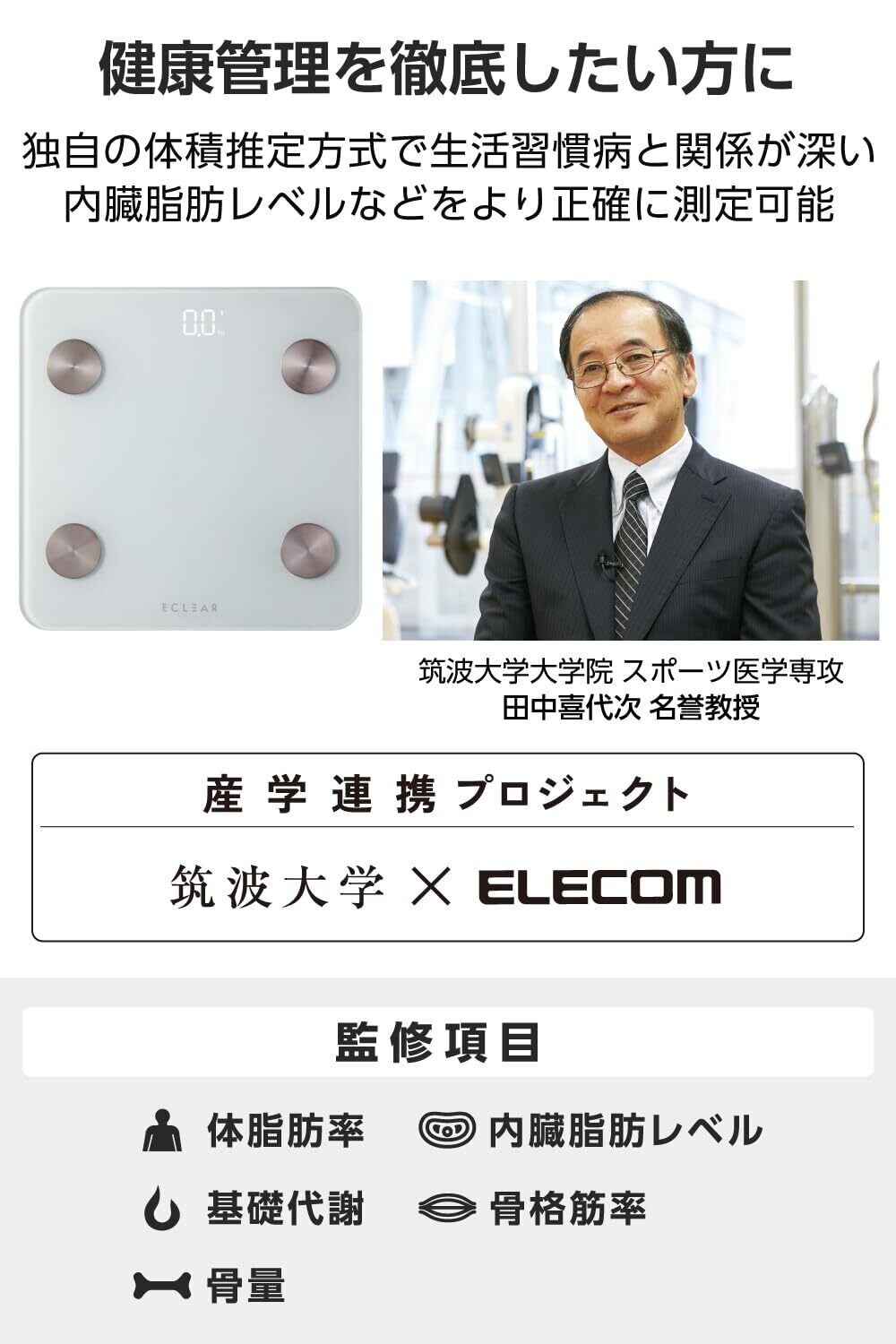 ■筑波大学との産学連携により、体積推定方式を採用した内蔵脂肪レベルや体脂肪率、骨格筋率などをより正確に測定可能となりました。