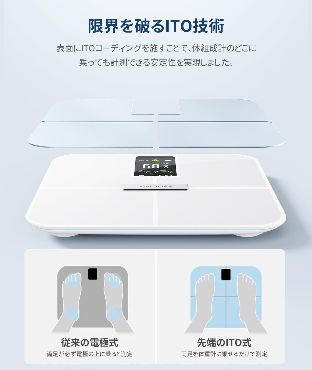 【ITO天板により広い測定エリア】体重計の天板にITOコーティング強化ガラスを使用します。ITOは透明電動膜とも呼ばれ、電気を通す性質を持っています。従来の体組成計のように体に微弱な電気を送るための大きな金属プレートが必要なく見た目もスマート。天板のどこに足を乗せても体組成の測定ができます。