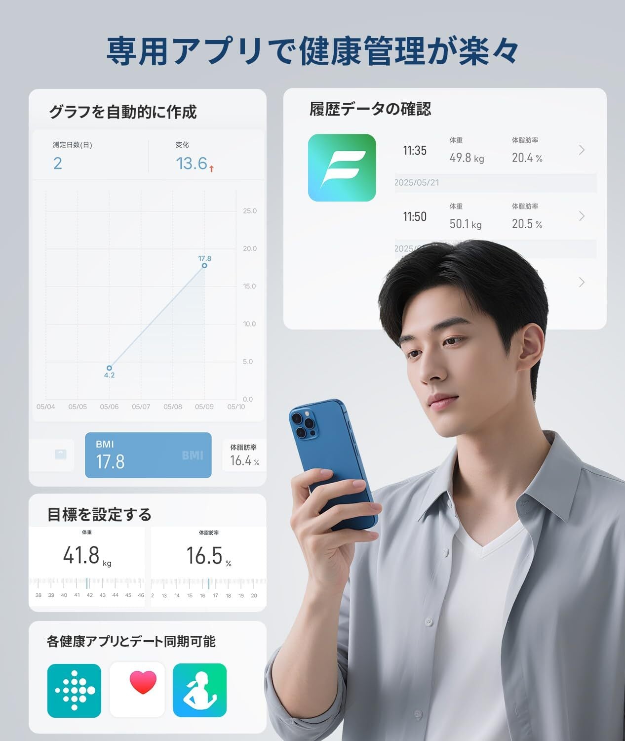 【専用管理アプリ:健康な身体づくりを細かくサポート】この体重計はスマホ連動で、専用の無料アプリですぐに25つの結果が表示!はかるに特化したシンプルアプリ。グラフや項目説明機能がわかりやすい!アプリで目標を設定し、履歴データを簡単に比較および表示して、減量とフィットネスへの十分なモチベーションを得ることが可能です。