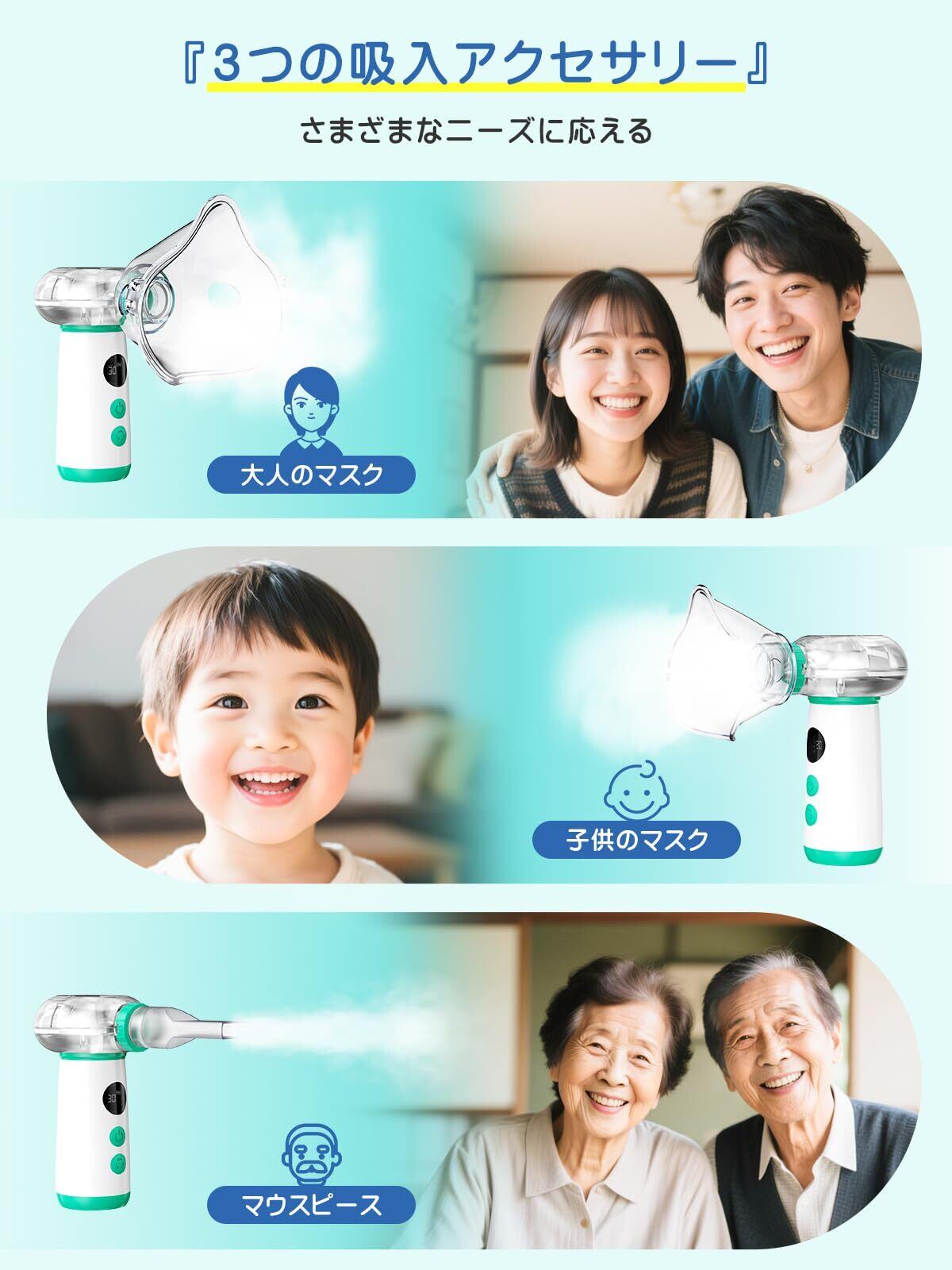 【静音設計・家族全員に快適】コンプレッサー式と異なり、超音波メッシュ方式を採用しているため、運転音は非常に静か。赤ちゃんや小さなお子様も安心して使用でき、夜間でも周囲を気にせず利用可能です。大人用マスク、子供用マスク、マウスピースの3種類を付属し、ご家族全員のニーズに対応します。