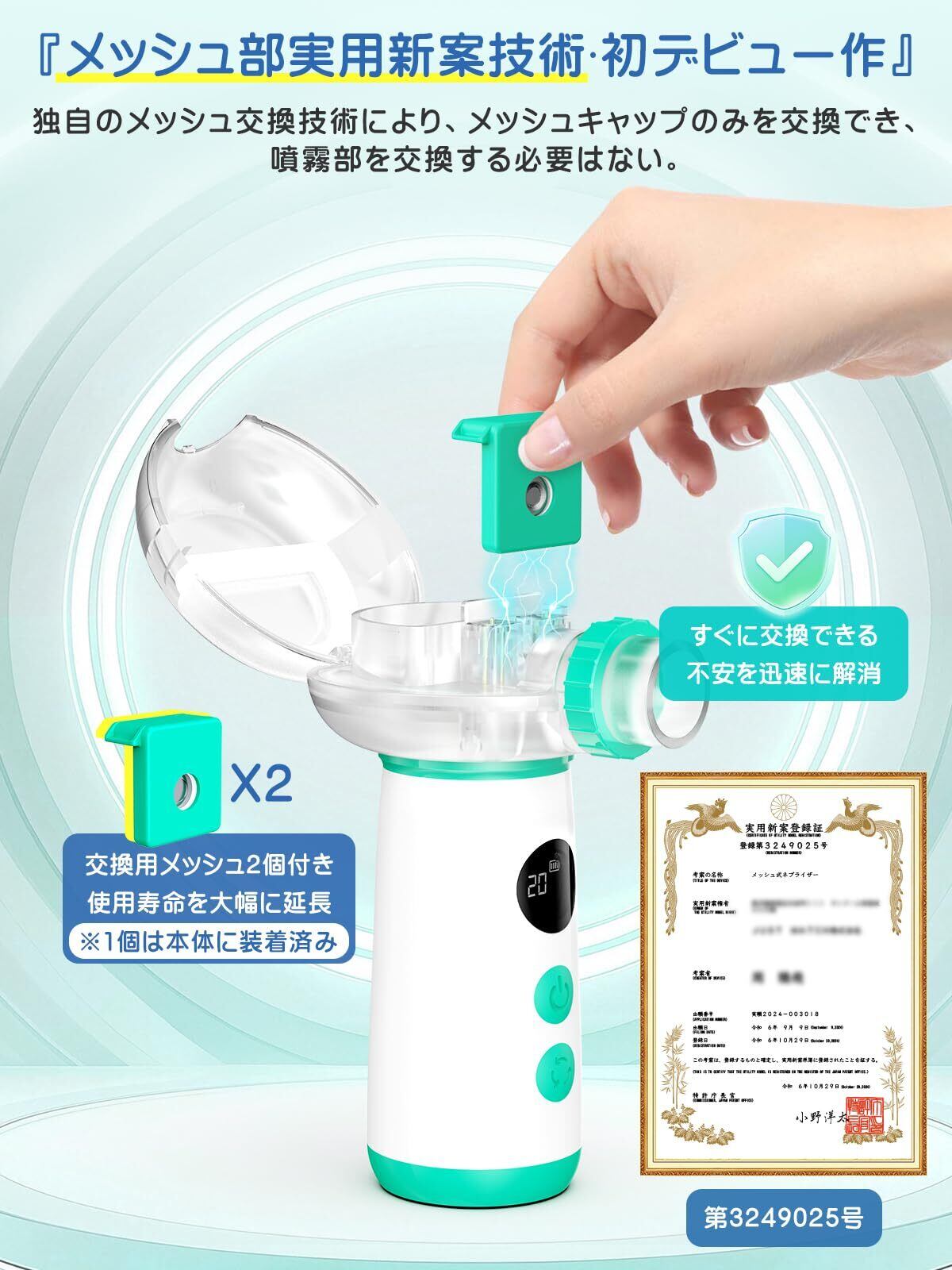 【メッシュ部交換・実用新案登録技術(第3249025号)】 実用新案登録済み(第3249025号)の独自メッシュ部交換技術により、薬液カップを交換せずにメッシュキャップのみを取り替え可能。消耗品コストを大幅に削減でき、経済的にも優れています。付属の交換用メッシュキャップ1個があれば、突然霧が出ない場合でもすぐに交換して継続使用が可能。霧が出ないという不安を瞬時に解消し、コスト削減と利便性を両立します。
