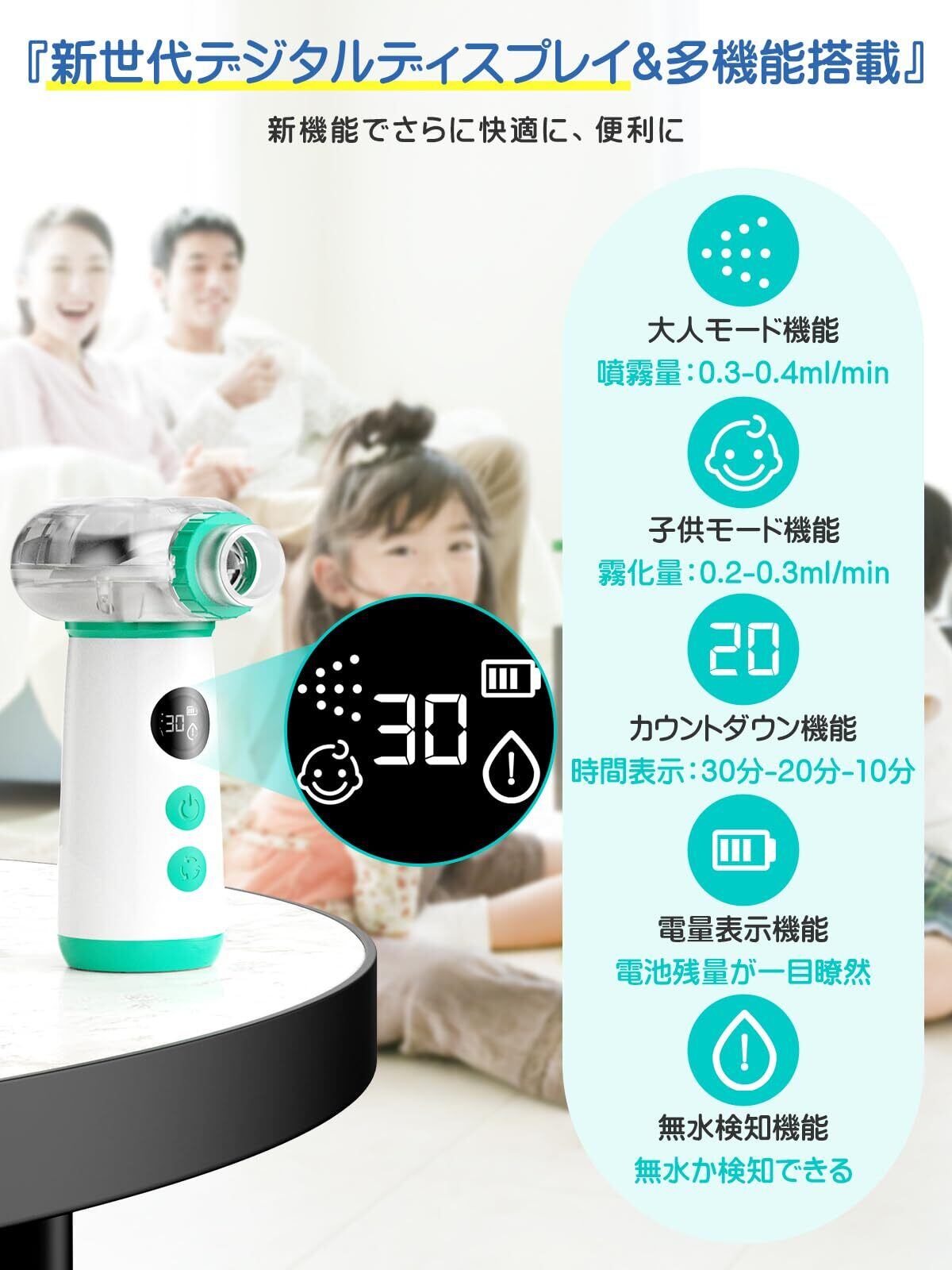 【デジタルディスプレイ&多機能搭載】 最新のデジタルディスプレイを採用し、視認性と操作性を向上。 大人モード:噴霧量 約0.3~0.4 mL/分で効率的に吸入 子供モード:噴霧量 約0.2~0.3 mL/分でやさしく吸入 カウントダウン機能:30分/20分/10分から選択可能 電池残量表示:バッテリー切れの不安を軽減 薬液切れ検知機能:薬液カップ内の無水状態を自動検知