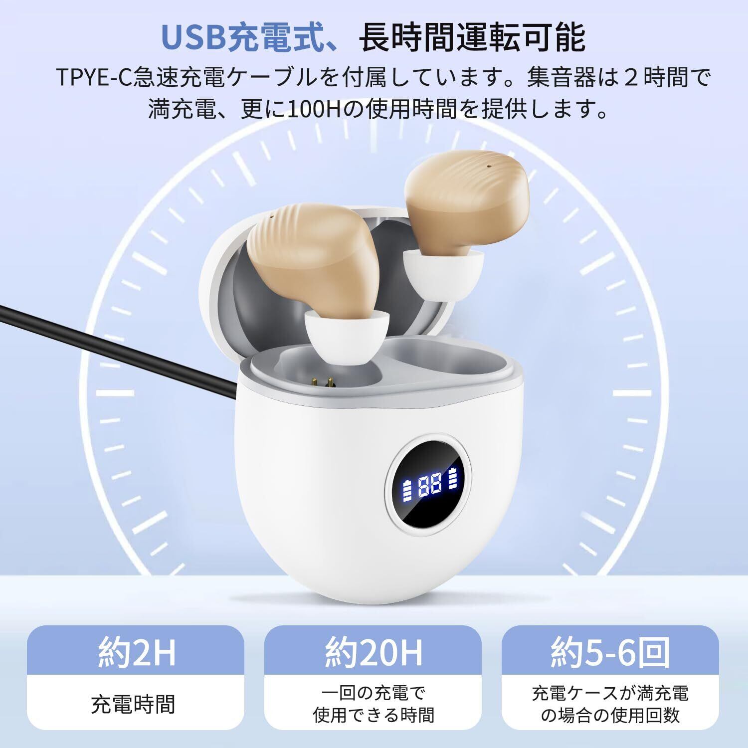 【Type-C充電式・電力残量表示】Munydayの充電式集音器はフル充電で20-30時間稼働可能です。充電ケースに大容量バッテリーが内蔵されており、集音器の使用時間をさらに100時間提供することができます。集音器を充電ケースに入れると充電が開始され約3時間でフル充電できます。充電ケースがフル充電になった場合は、集音器を約5-6回充電することができます。また、充電ケースのバッテリー残量はLEDディスプレイに数字で表示され、電力残量が一目瞭然で確認できます。